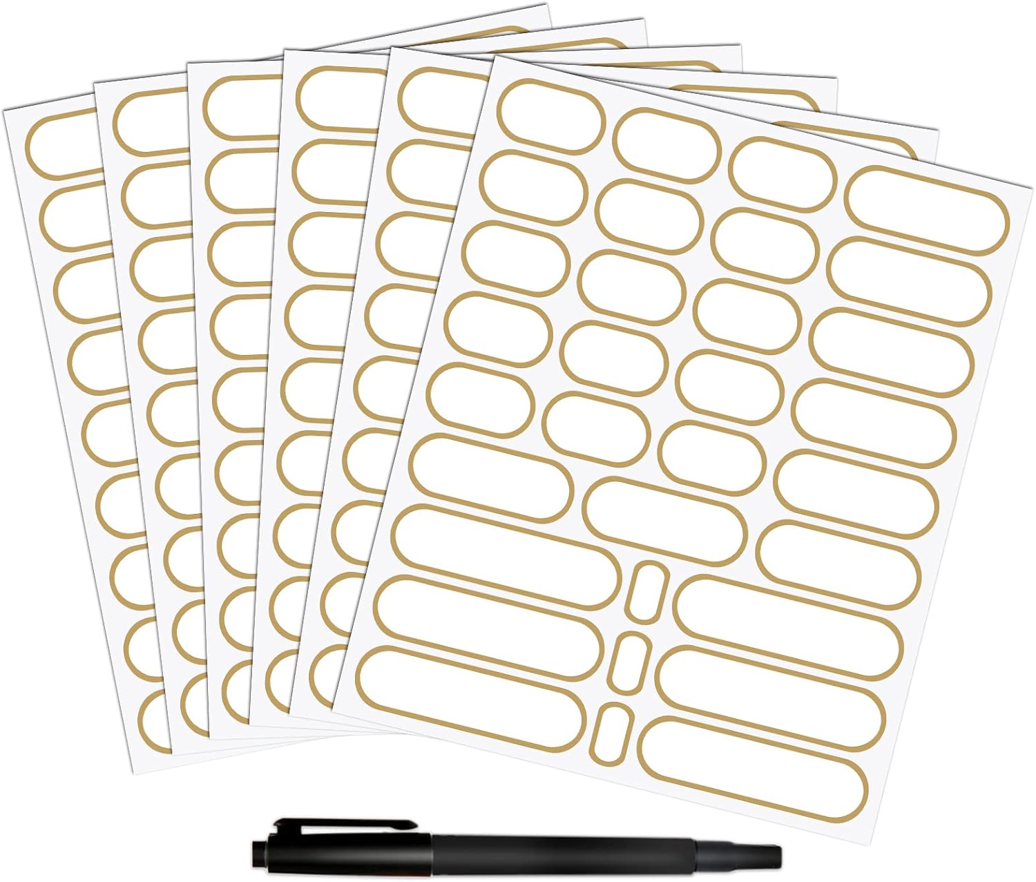 - Labels with Gold Border for Kitchen Organization - 192 write-on sticker labels designed in 4 sizes to fit the most sizes of food storage containers, bottles, canisters and jars - 3.54"x0.98"(36PCS) + 2.53"x0.98"(48PCS) + 1.66"x0.98"(90PCS) + 0.98"x0.56"(18PCS) . 2 markers included. Black marker included