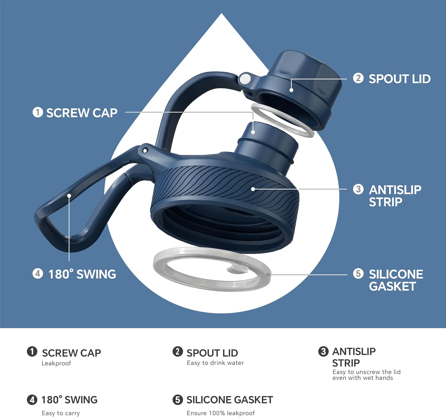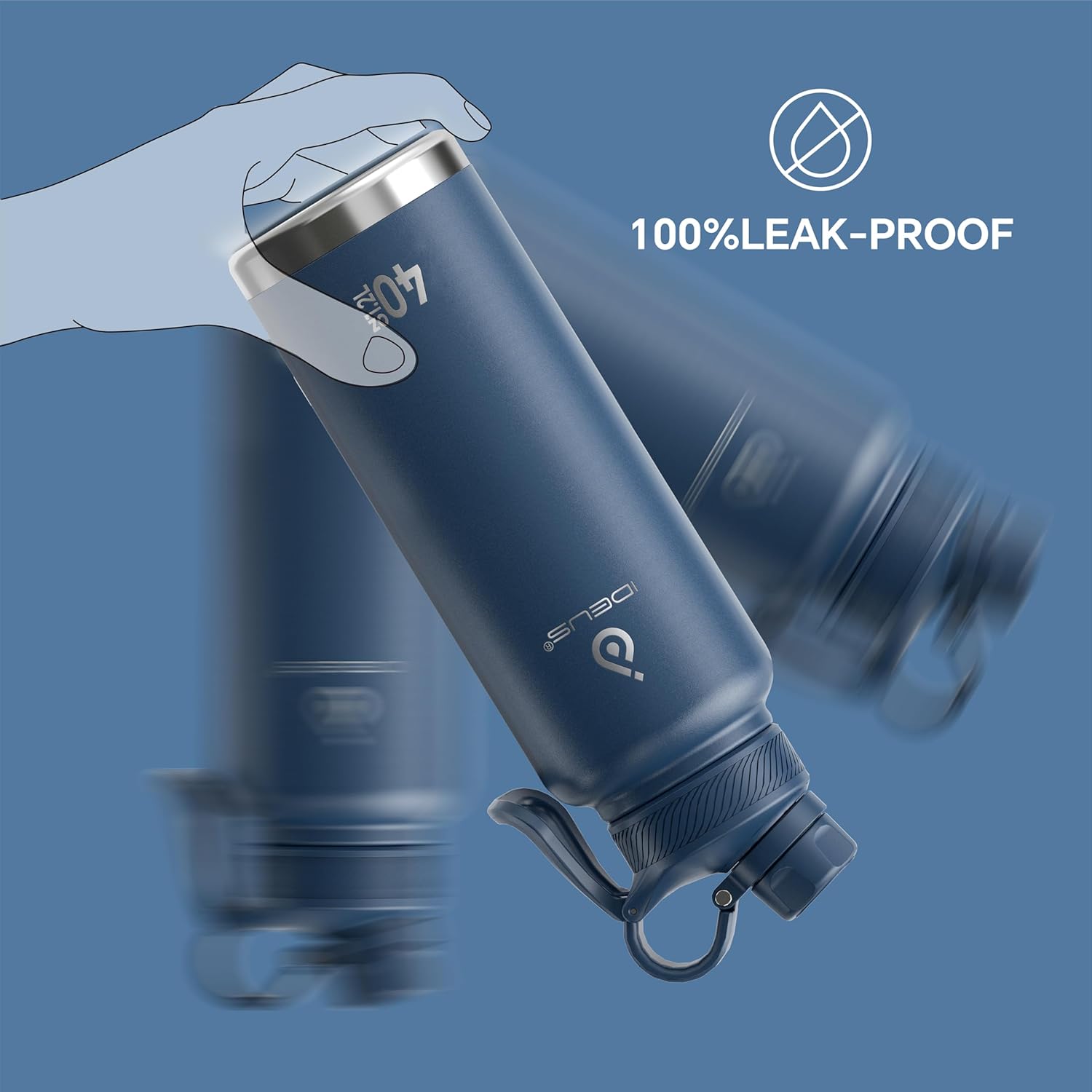 IDEUS Insulated Stainless Steel Water Bottle with 2 Leak-Proof Lids, Thermal Water Flask for Hiking Biking, 40oz, Navy Blue
