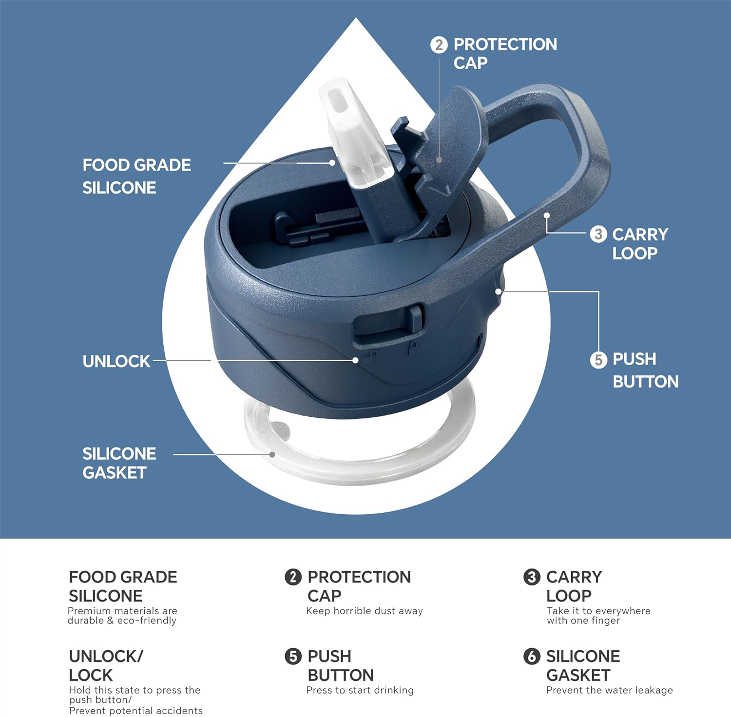 IDEUS Insulated Stainless Steel Water Bottle with 2 Leak-Proof Lids, Thermal Water Flask for Hiking Biking, 18oz, Navy Blue