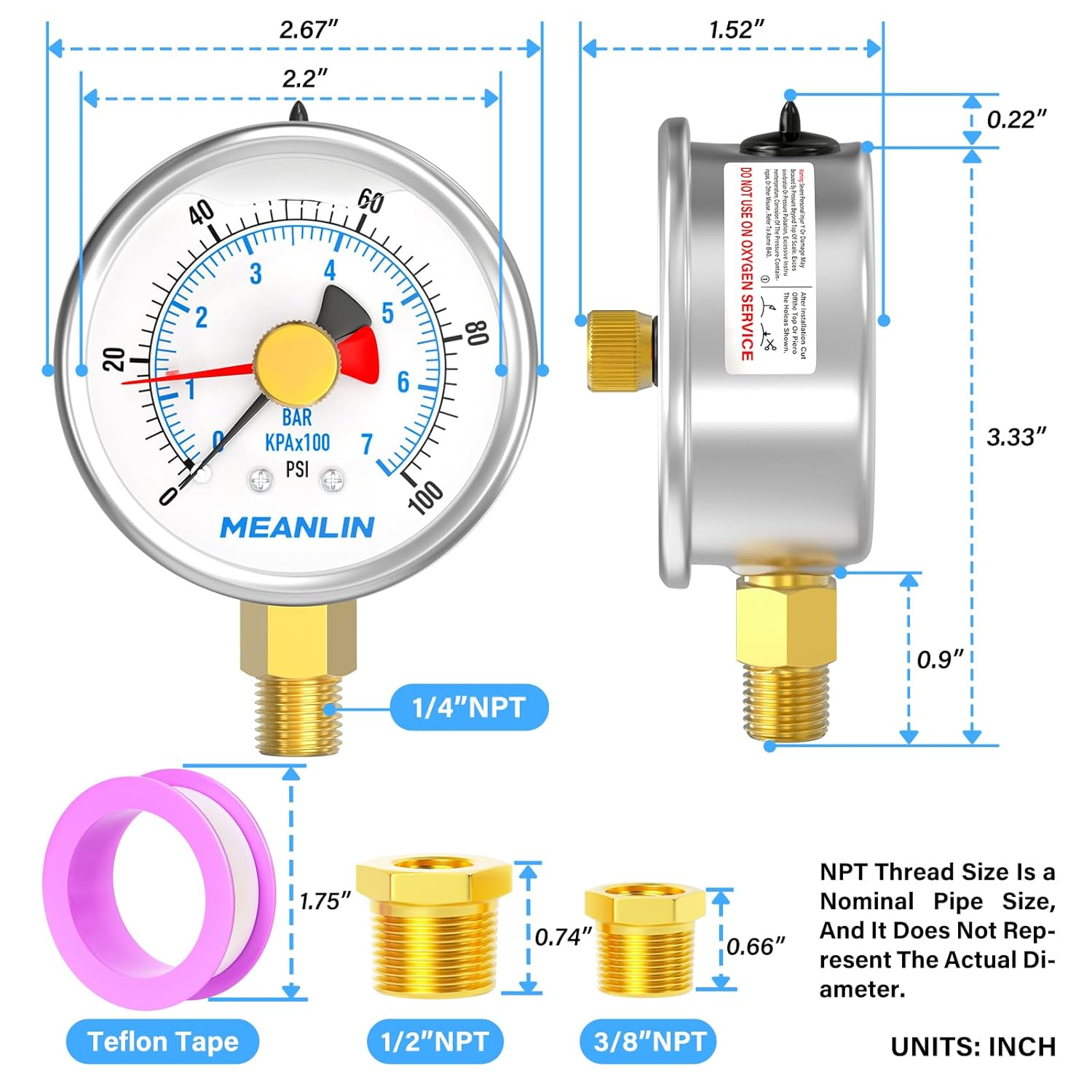 MEANLIN MEASURE 0~100Psi Stainless Steel 1/4" NPT 2.5" FACE DIAL with Reset Pointer Liquid Filled Pressure Gauge WOG Water Oil Air, Lower Mount, with 1/8" x 1/4" NPT and 1/8" x 3/8" NPT Hex Bushing