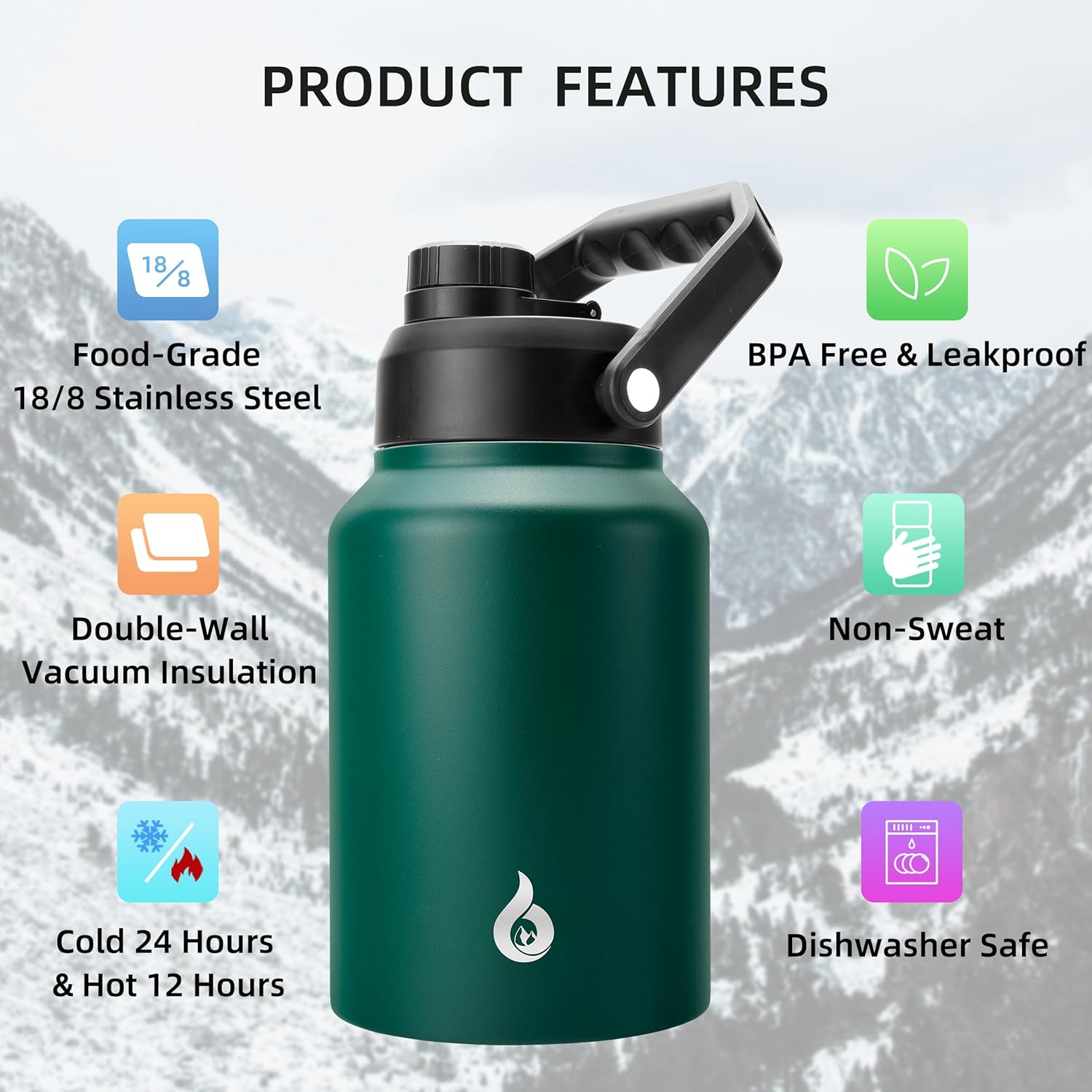 - INSULATED WATER BOTTLE: BJPKPK half gallon water bottle use double-walled vacuum insulation technology to keep your beverage cold for up to 24 hours, or hot for up to 12 hours, make sure you enjoy your favorite beverages at the most suitable temperature all day