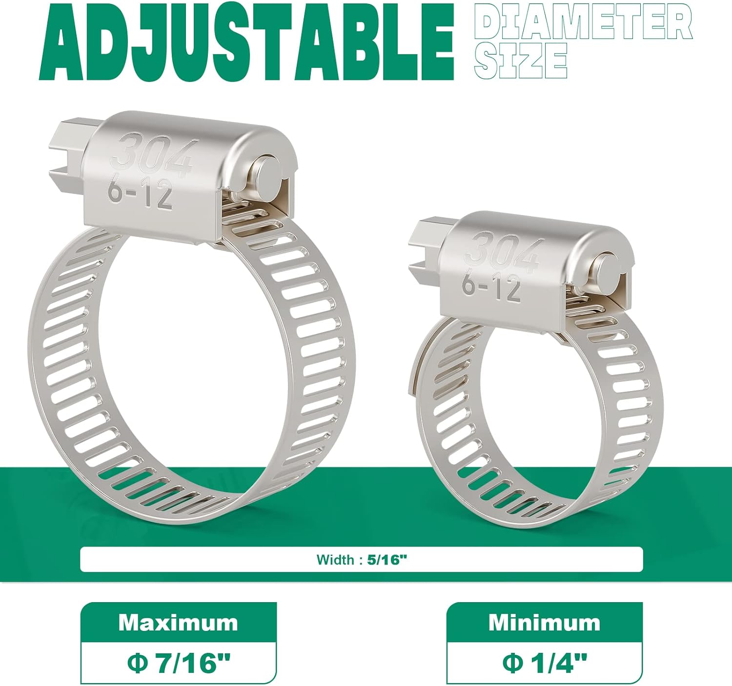 - Adjustable Size Range —Flexible size adjustment,adjustable from 1/4 inch to 7/16 inch (6-12mm).You can use a screwdriver to adjust the size according to your needs.These worm gear hose clamps can be reused and recycled,our quality can withstand long working hours,saving you a lot of money