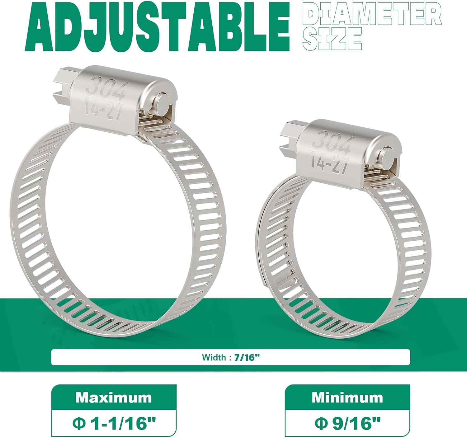 - Adjustable Size Range —Flexible size adjustment,adjustable from 9/16" inch to 1 inch to 1/16" inch (14-27mm).You can use a screwdriver to adjust the size according to your needs.These worm gear hose clamps can be reused and recycled,our quality can withstand long working hours,saving you a lot of money
