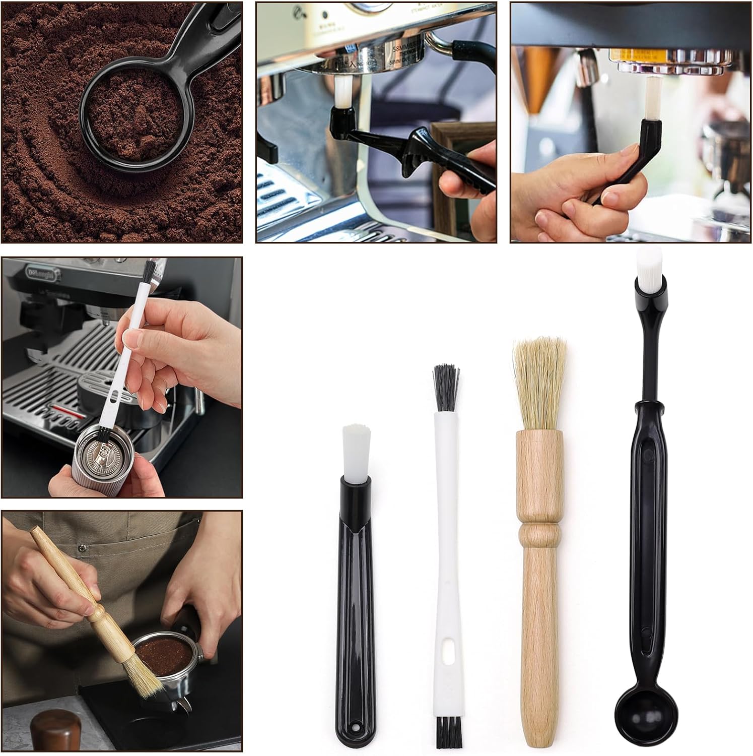 - 4-pack: Coffee Grinder Cleaning Brush, Heavy Duty Wooden Handle and Natural Bristles Wood Dusting Espresso Brush and Nylon Espresso Maker Brush with Spoon,Essential props to keep your espresso machine equipment free of coffee grounds, Professional Barista Dusting Cleaning Tools