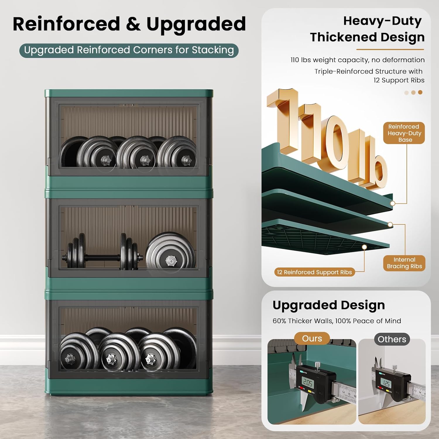 8.4Gal Collapsible Storage Bins with Lids & Wheels - 1 Pack Stackable with Doors, Heavy-Duty Plastic Containers for Home/Office, Green