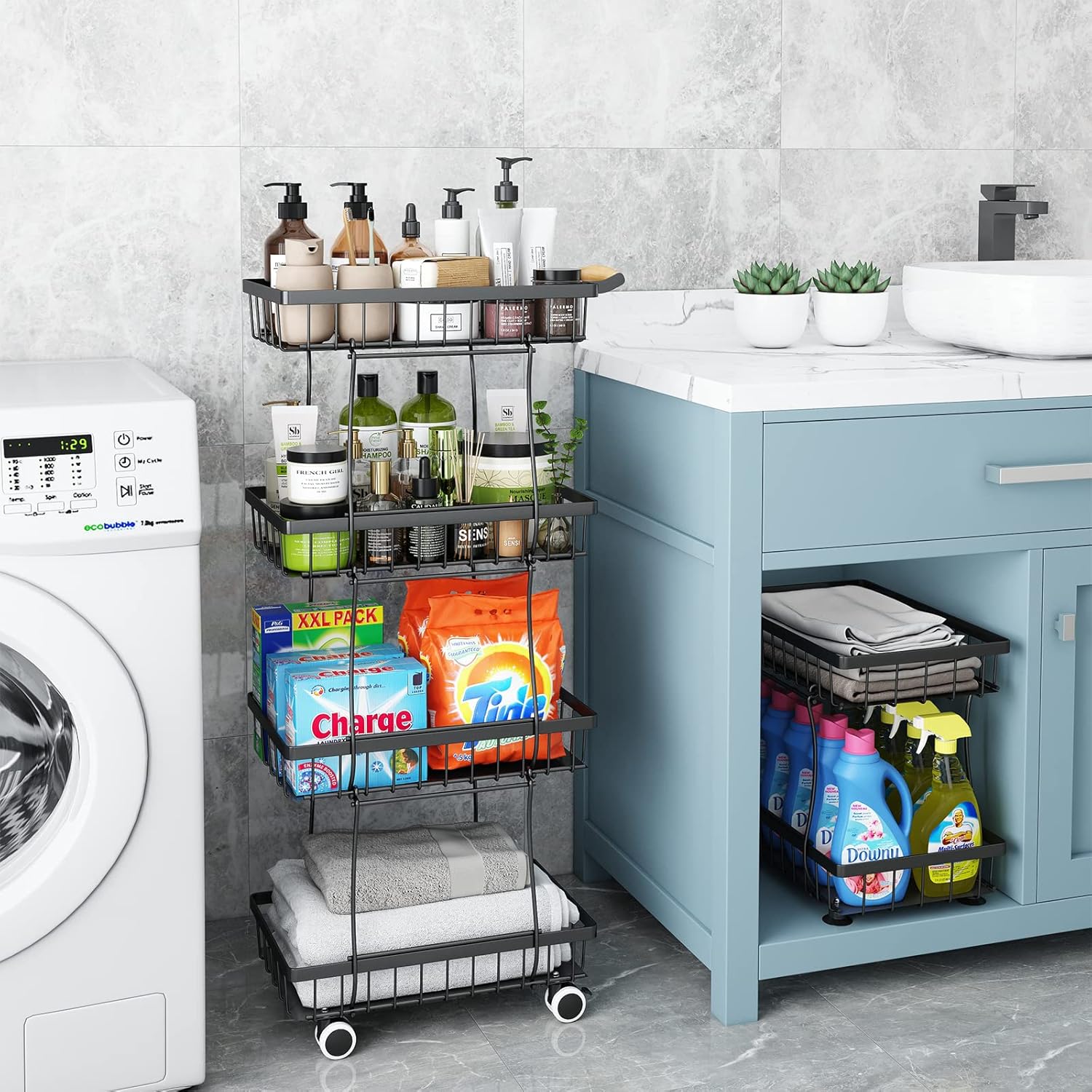 - Double Base Basket Design: Each layer of baskets can be stackable and detachable, you can combine the baskets freely in 1 to 4 tiers to match the height you need.Come with 2 base baskets,can be freely combined into 2x2 storage baskets by 4 rolling wheels and 4 non-slip foot pads