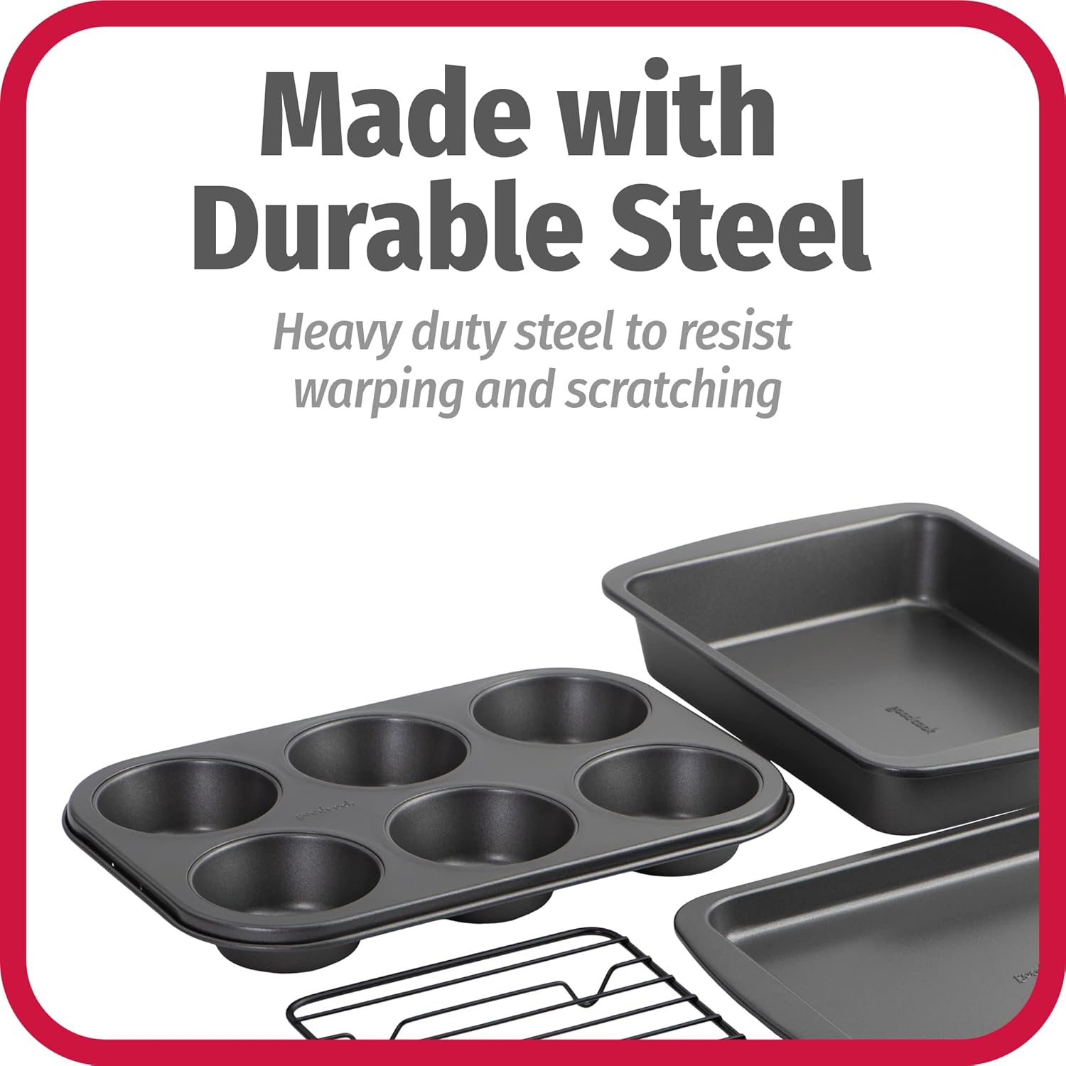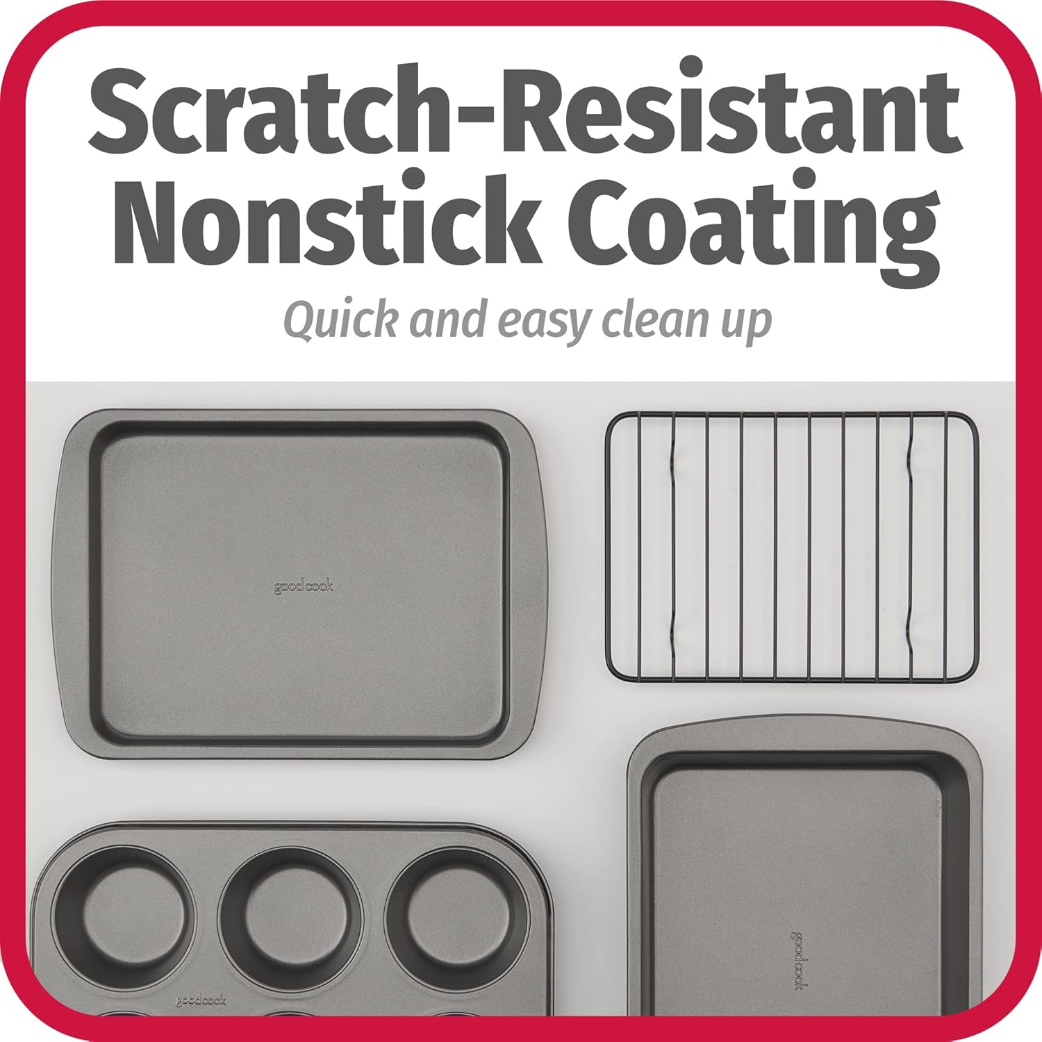 GoodCook 4-Piece Nonstick Steel Toaster Oven Set with Sheet Pan, Rack, Cake Pan, and Muffin Pan, Gray, 4-Piece Set Distributes Heat Evenly, Nonstick Coating, Dishwasher-Safe