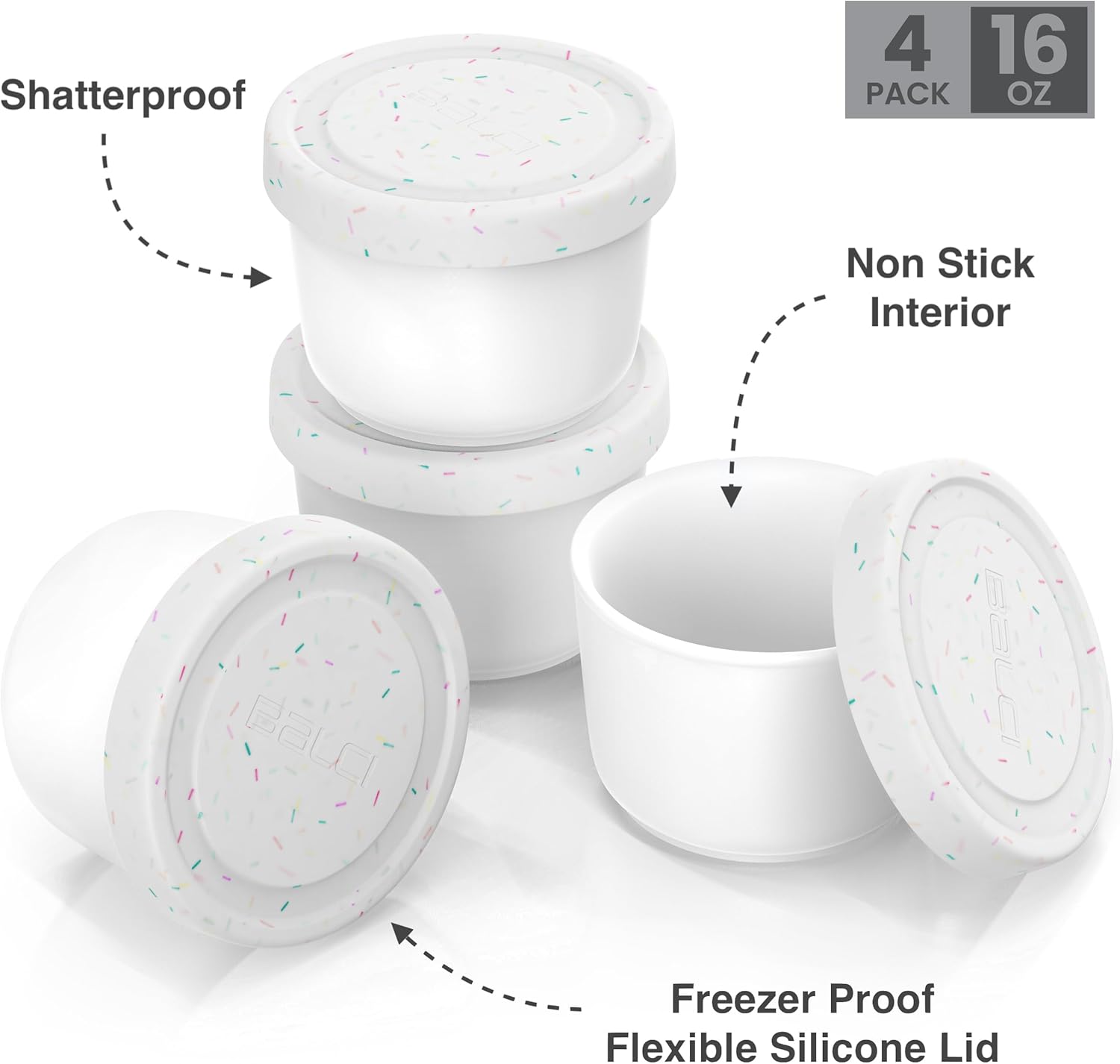 BALCI - 16oz Ice Cream Containers with Silicone Lids (Set of 4) - 1 Pint Each Freezer Food Storage Containers, Reusable, LeakProof, For Homemade IceCream Containers - White with Sprinkles