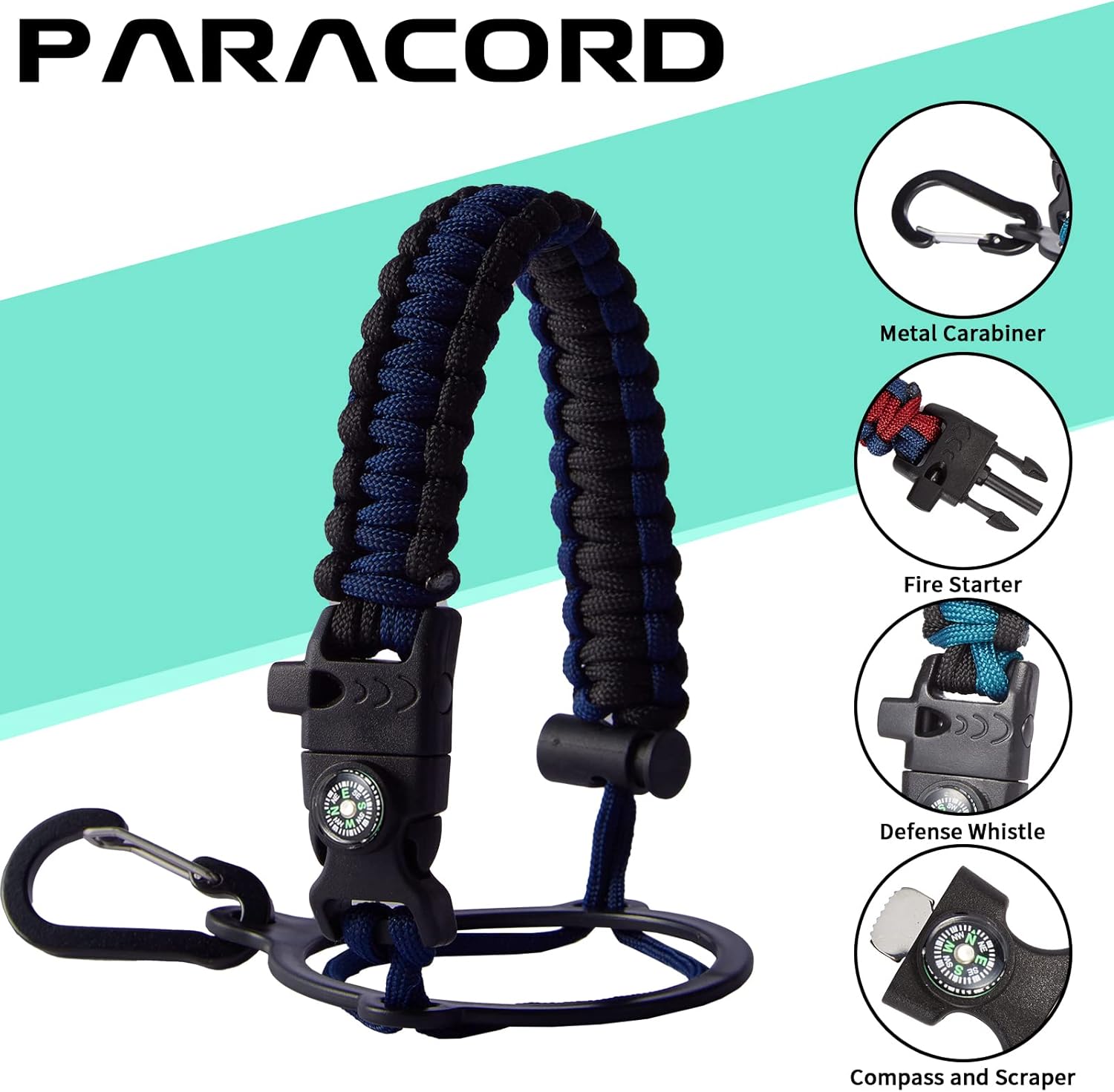 - UNIQUE DESIGNS PARACORD HANDLE: Full-function paracord handle made in individual styles to match the color of the flask water bottles. With compass, safety ring, carabiner, flint fire starter & whistle. It unravels into a sturdy and taut rope in an emergency, making the large water jug an ideal survival kit for expeditions in the wild