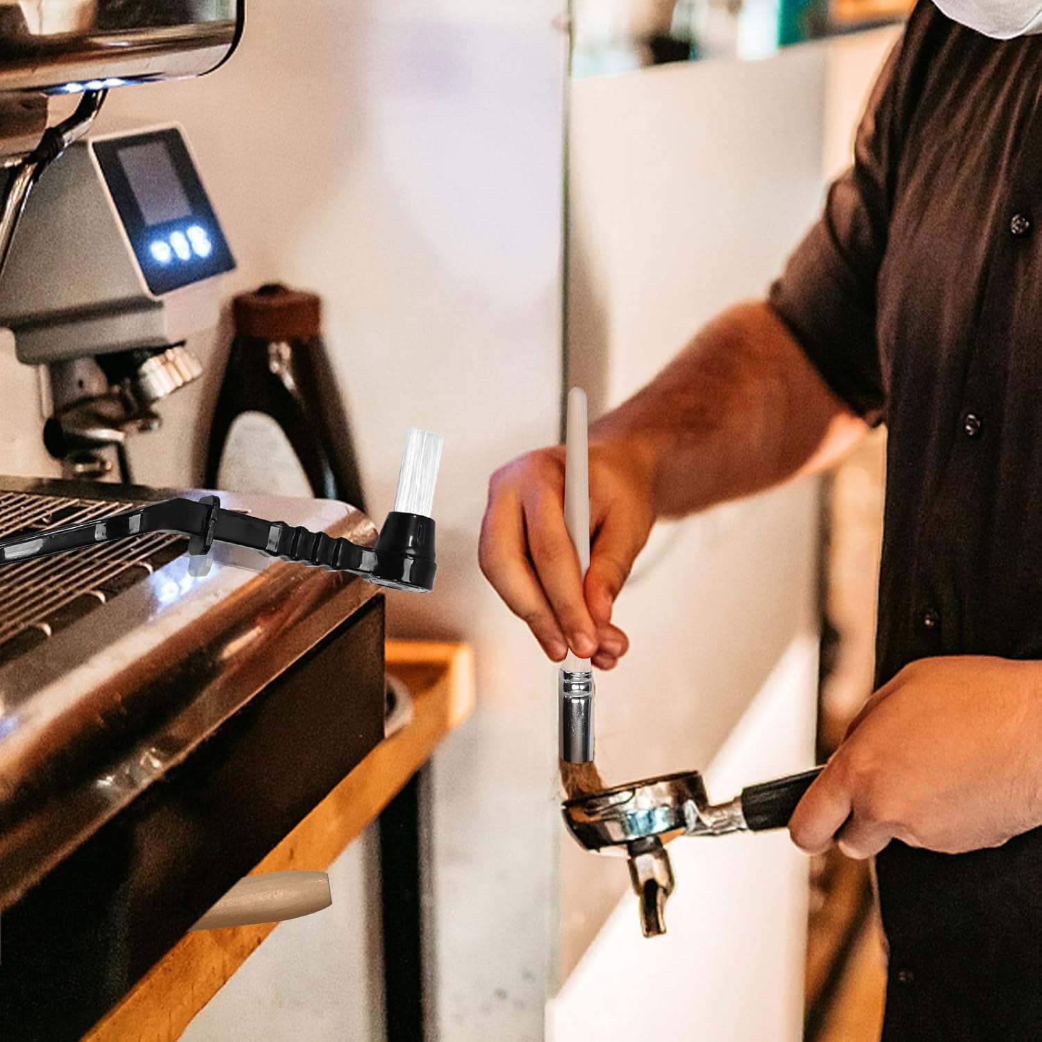 - Package Includes: 9PCS coffee machine cleaning brush, two black handle coffee machine brushes, four wood handle bristle brushes - two in size, two two in one coffee machine brushes with spoons, and one white handle brush