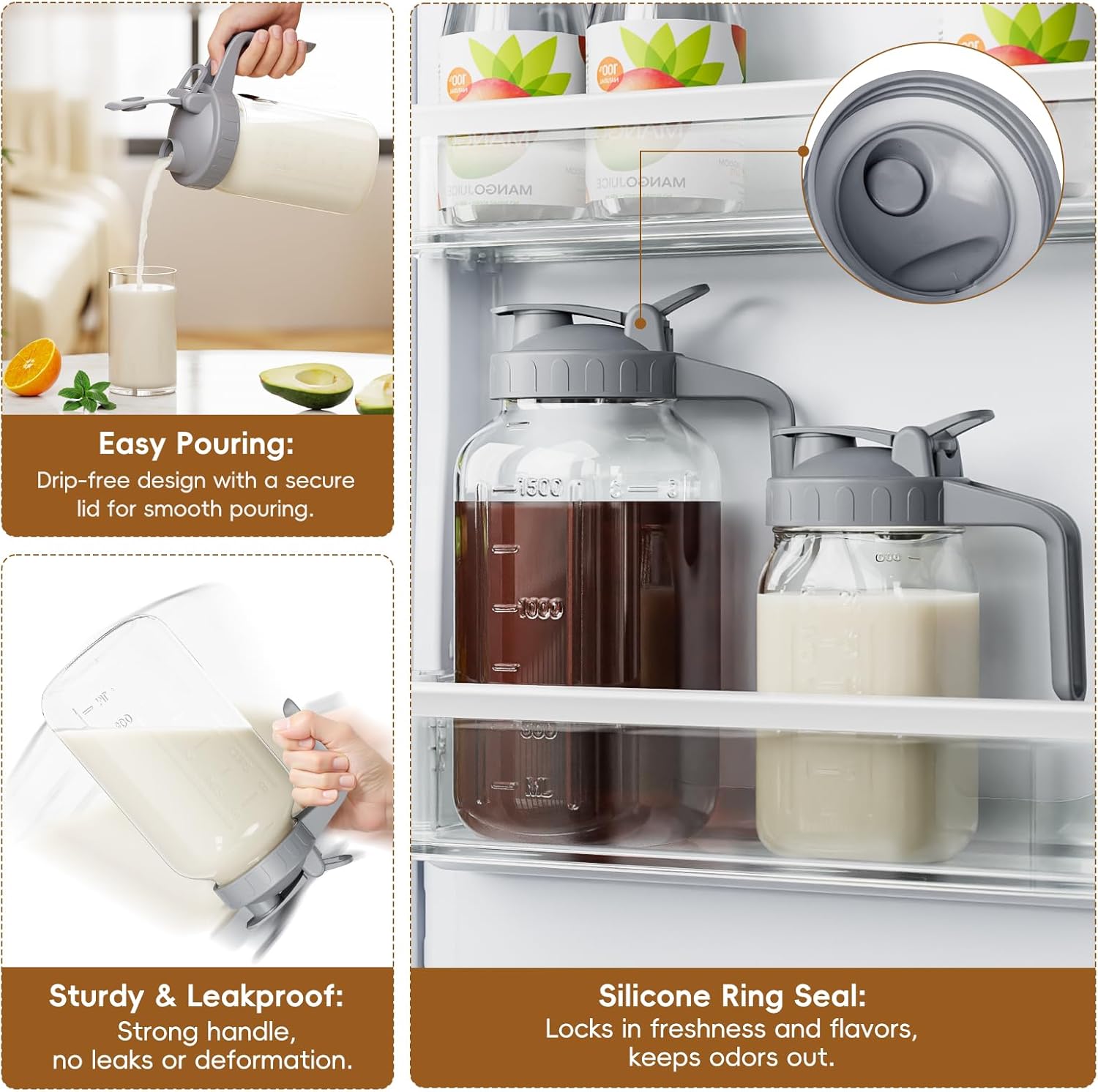 - 【Spout Sealed Lid with Handle】 - The 64oz big jug with silicone seal in the pour spout lid, Leak proof and better maintain the freshness and taste of the beverage, avoid mixing the smell of other foods in the fridge. The flip-top lid is easy to pour and the jug is securely fastened to the lid