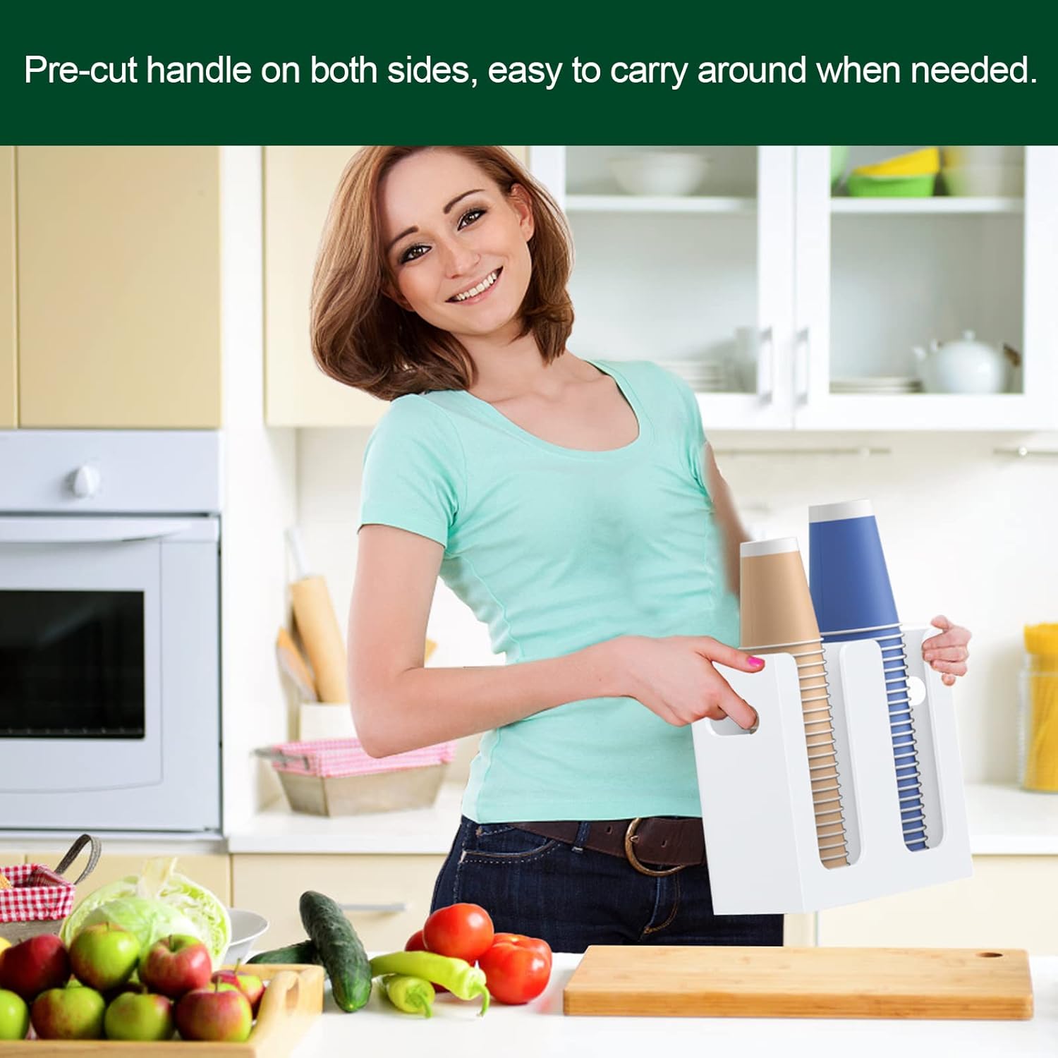 - Cup Dispenser with Handles on Both Sides - pre-drilled handles on side and holes on back, provides more possibilities, either mount it on wall of your kitchen or office, or let it stand along the side of your cabinet in the trailer, you make the decision.