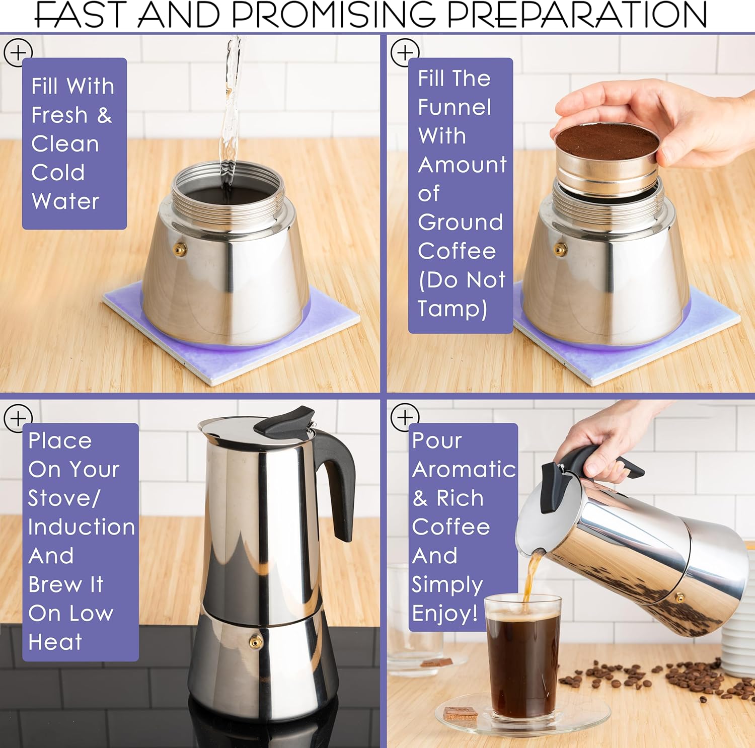 - Easy to Use Stovetop Espresso Maker: Fill lower chamber with water and ground coffee, heat on stovetop, to enjoy espresso in minutes. Wait 1 min after brewing before opening to avoid pressure-related spills