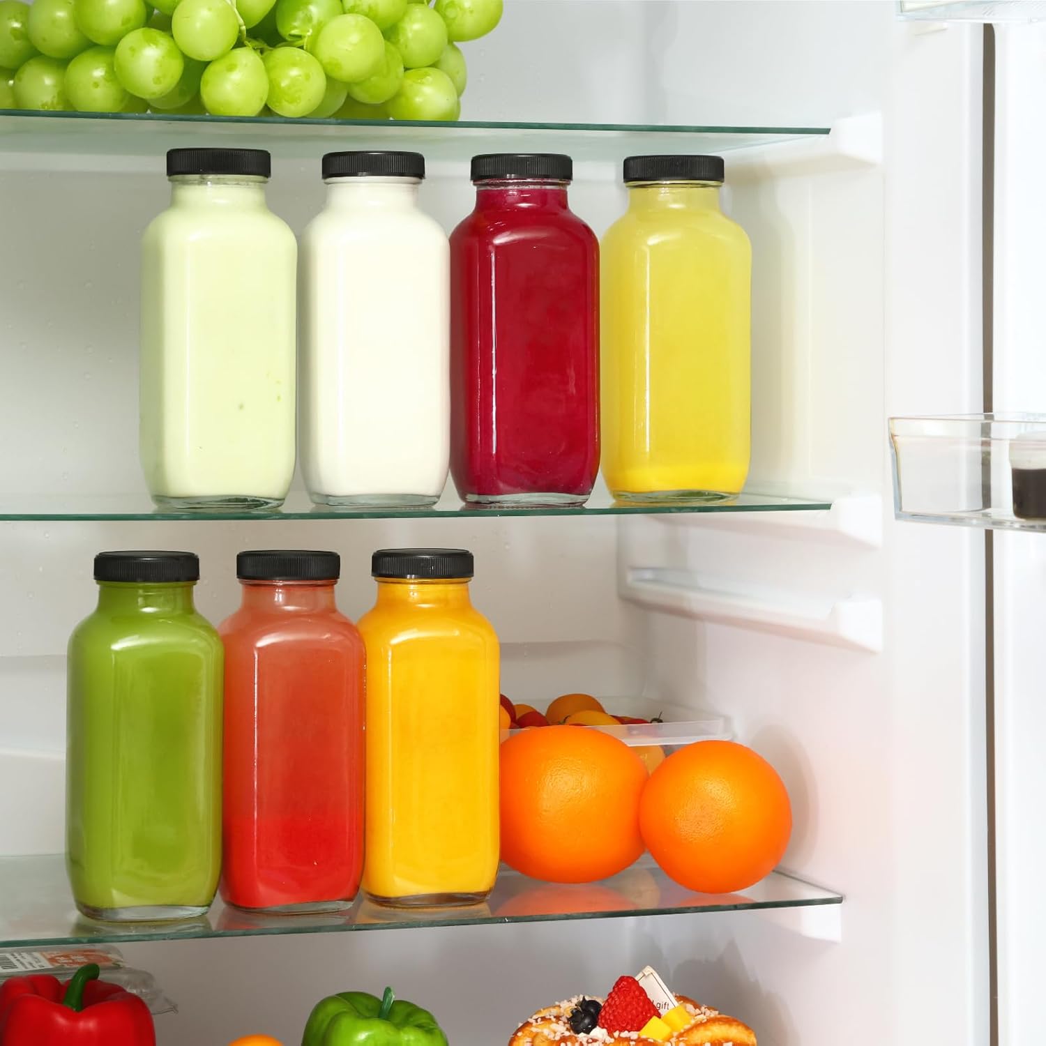 - Package Included: Our juice bottle set contains 24pcs 16oz square glass drinking bottles with black lids, 1 silicone funnel, 1 long-handled cleaning sponge brush, 2 stainless steel straws, 1 straw brush and 24 sheets of round blank waterproof stickers.