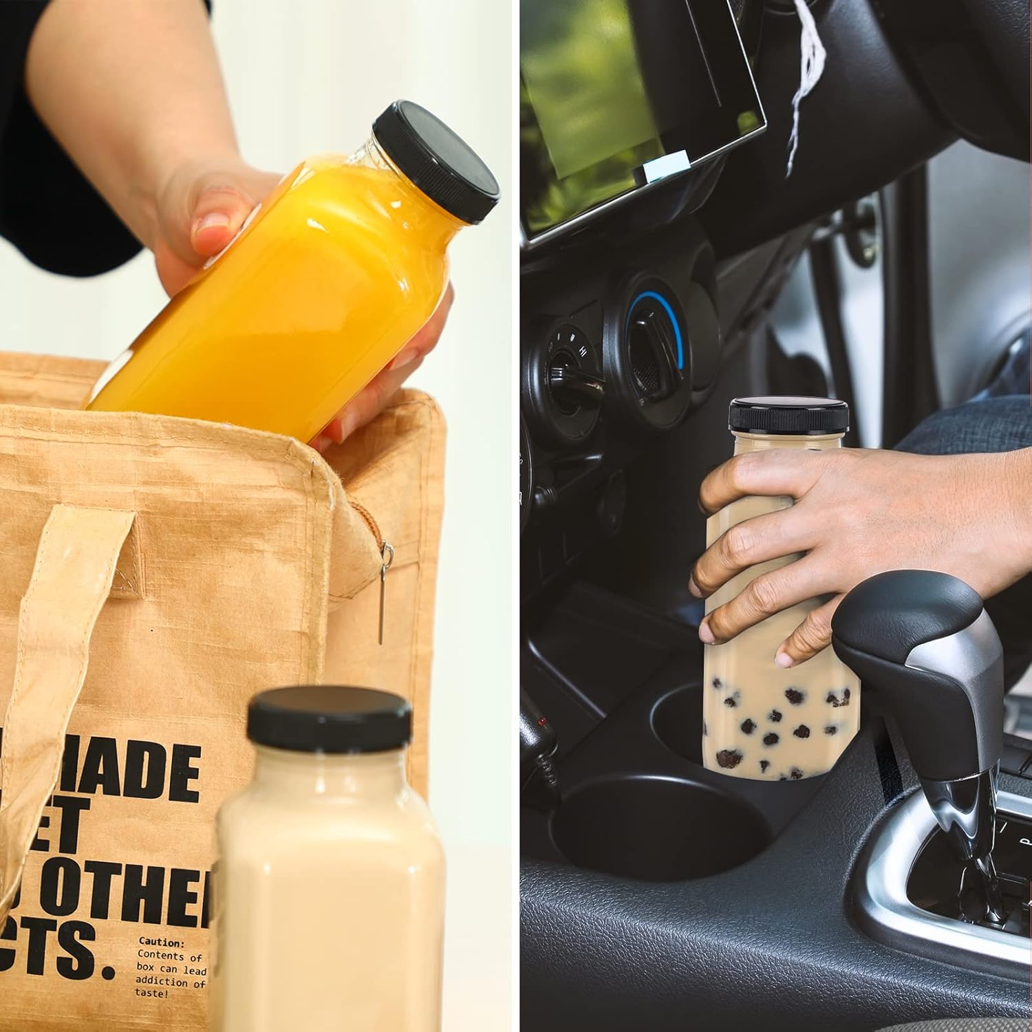 - Portable Drinking Bottle: Wide mouth glass bottle can be used to store all kinds of drinks, juice, squeeze, milk, coffee, milkshake, kombucha, etc. After sealed with the plastic lid, the small water bottle can be conveniently put in your backpack or car, very convenient.