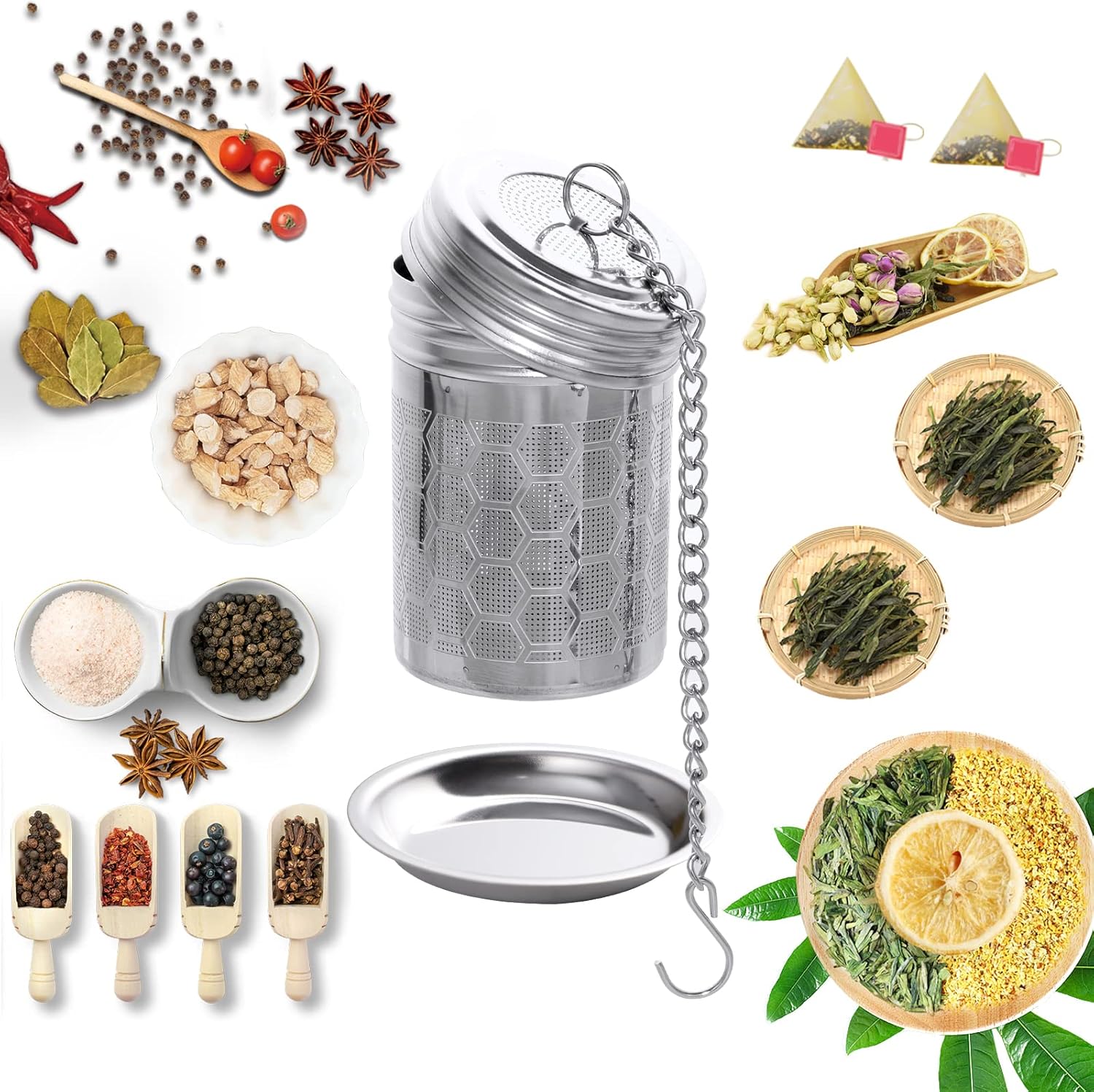 - 【Excellent Design】0.5mm ultra-fine filter can filter 99.99% of tea leaves, let 100% of tea fragrance fill your cup. Hook and chain design protects your fingers from burns. 2 drip trays keep your table tidy when making tea.