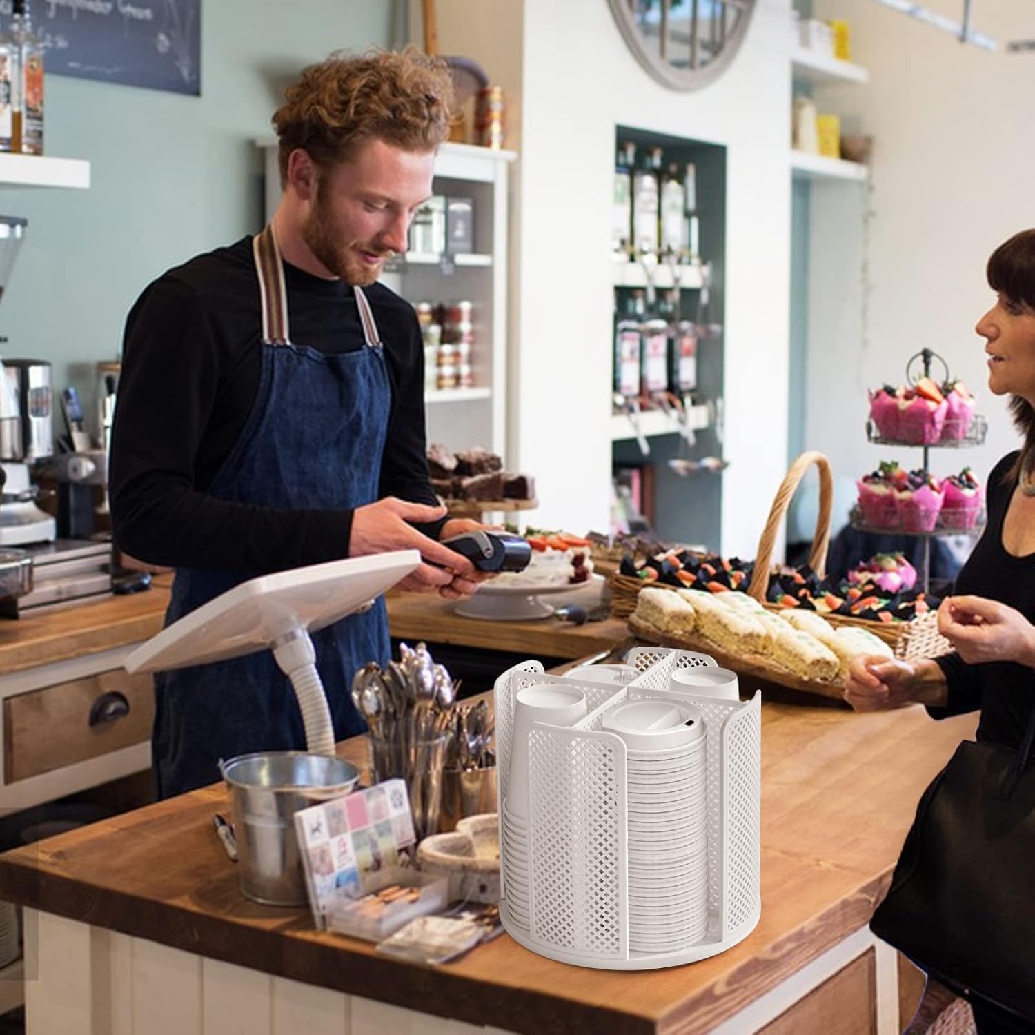 - 【Plastic Coffee cup & lid storage Carousel】 The disposable coffee cup holder is made of PS, does not contain harmful substances, rust-proof. The coffee cup holder has 4 compartments, easy 360° rotation for easy access.