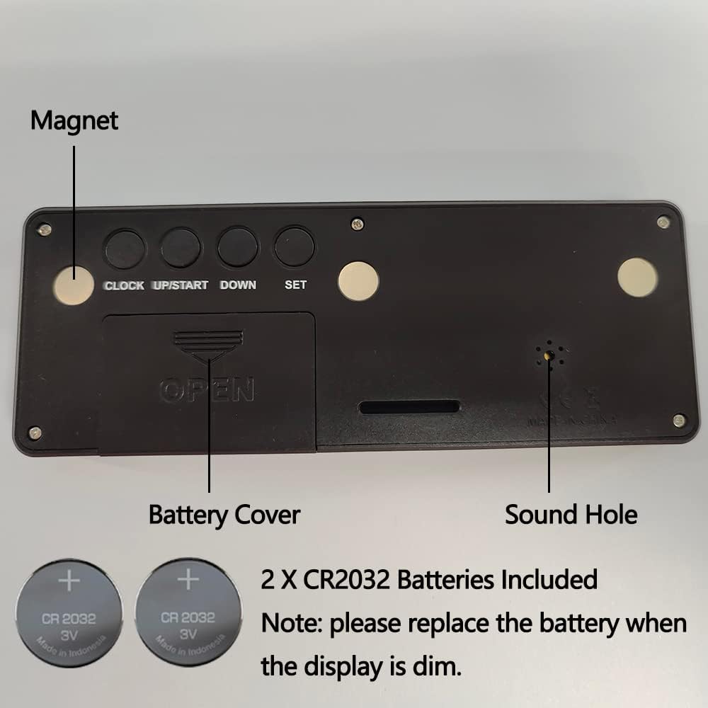 - ✔️Easy to Set: There are four buttons: SET, DOWN, UP/START and CLOCK. Two ways to place it. It has a little removable stand and 3 inset strong magnets at the back to stick on metal surface.