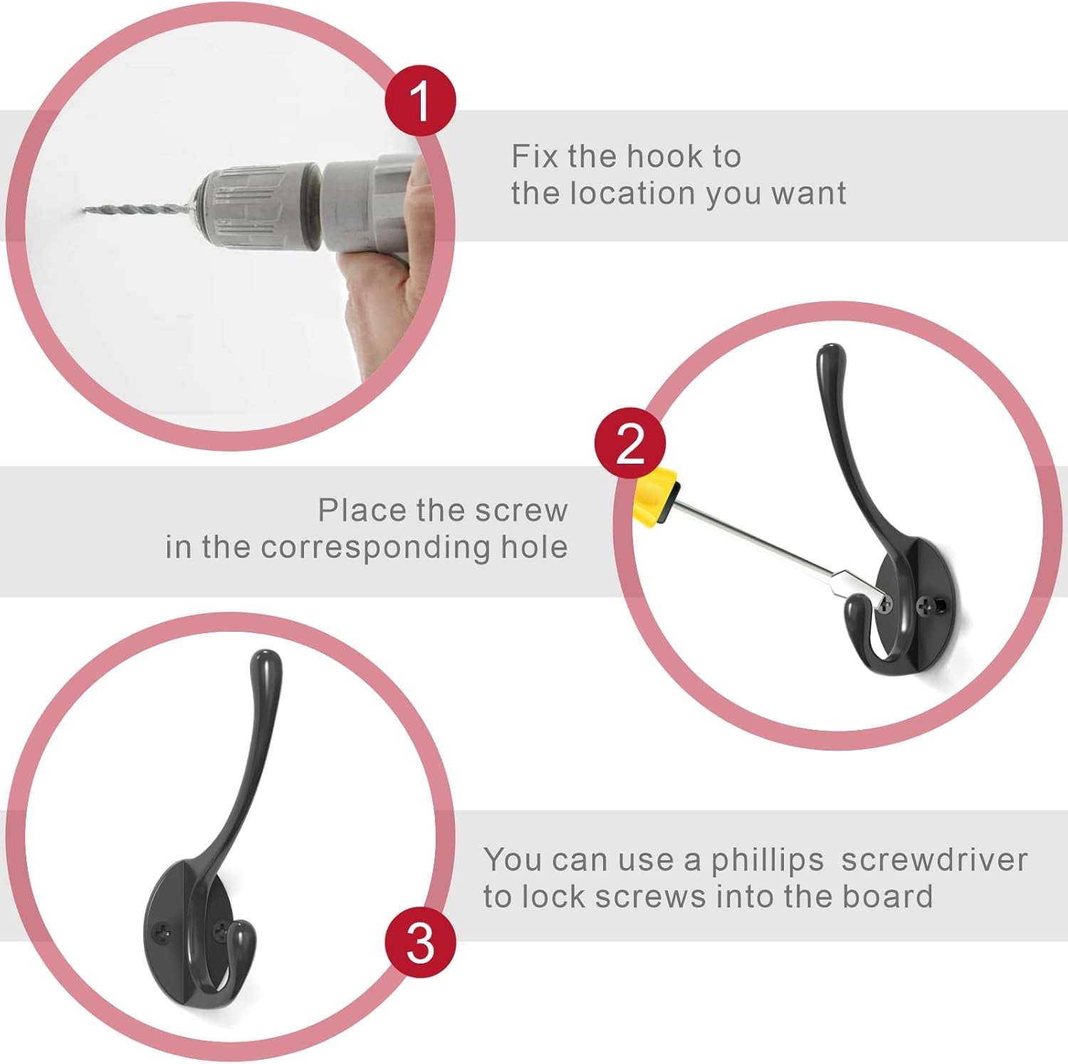 - Material: The Coat Hooks not easy to break, anti-rust and anti-corrosion, The Coat hooks and screws are made of good quality zinc die-cast material, which is hard and durable