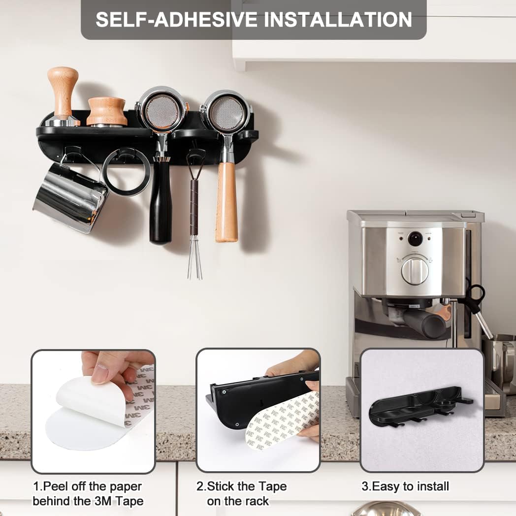 - 【Clean & Neat】Our coffee accessories wall mount rack is designed with coffee distributor holders and portafilter slots, and 3 hanging hooks for easy access and quick drying. The coffee storage organizer neatly store your espresso portafilters, coffee tampers, coffee stirrers, coffee cups and other coffee maker tools, makes full use of wall space to free up the counter space, keep countertop clean, tidy and organized.