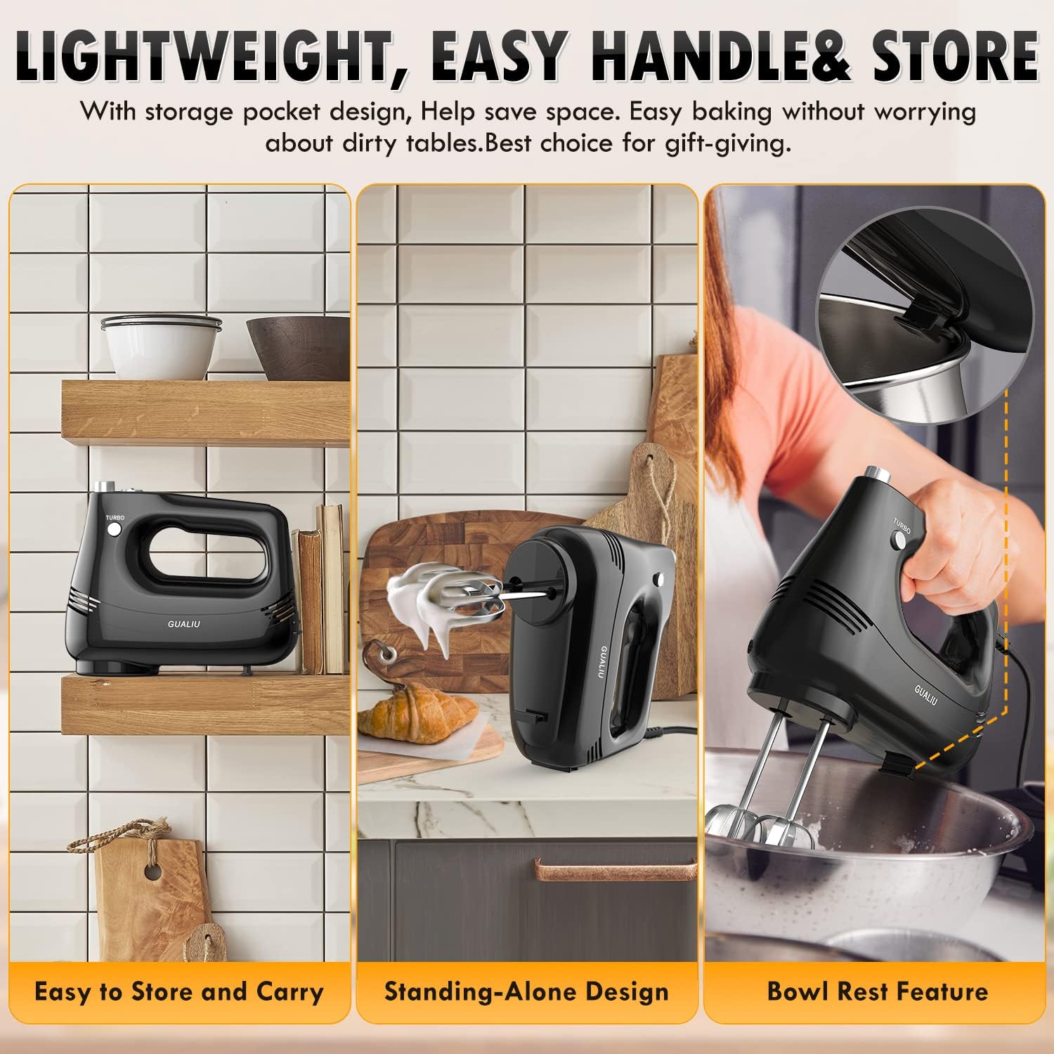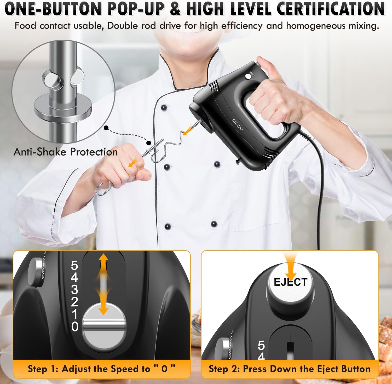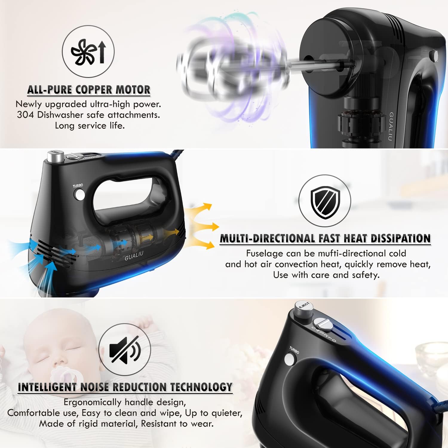 - 🧇【𝐓𝐮𝐫𝐛𝐨 𝐁𝐨𝐨𝐬𝐭 & 𝐒𝐞𝐥𝐟-𝐂𝐨𝐧𝐭𝐫𝐨𝐥 𝐒𝐩𝐞𝐞𝐝】: GUALIU hand mixer features a 5-speed self-controlled speed and an additional turbocharging feature that allows you to choose the best mixing speed for any recipe. Suitable for whipped cream, butter, egg whites and batter, as well as mashed potatoes and other dishes!