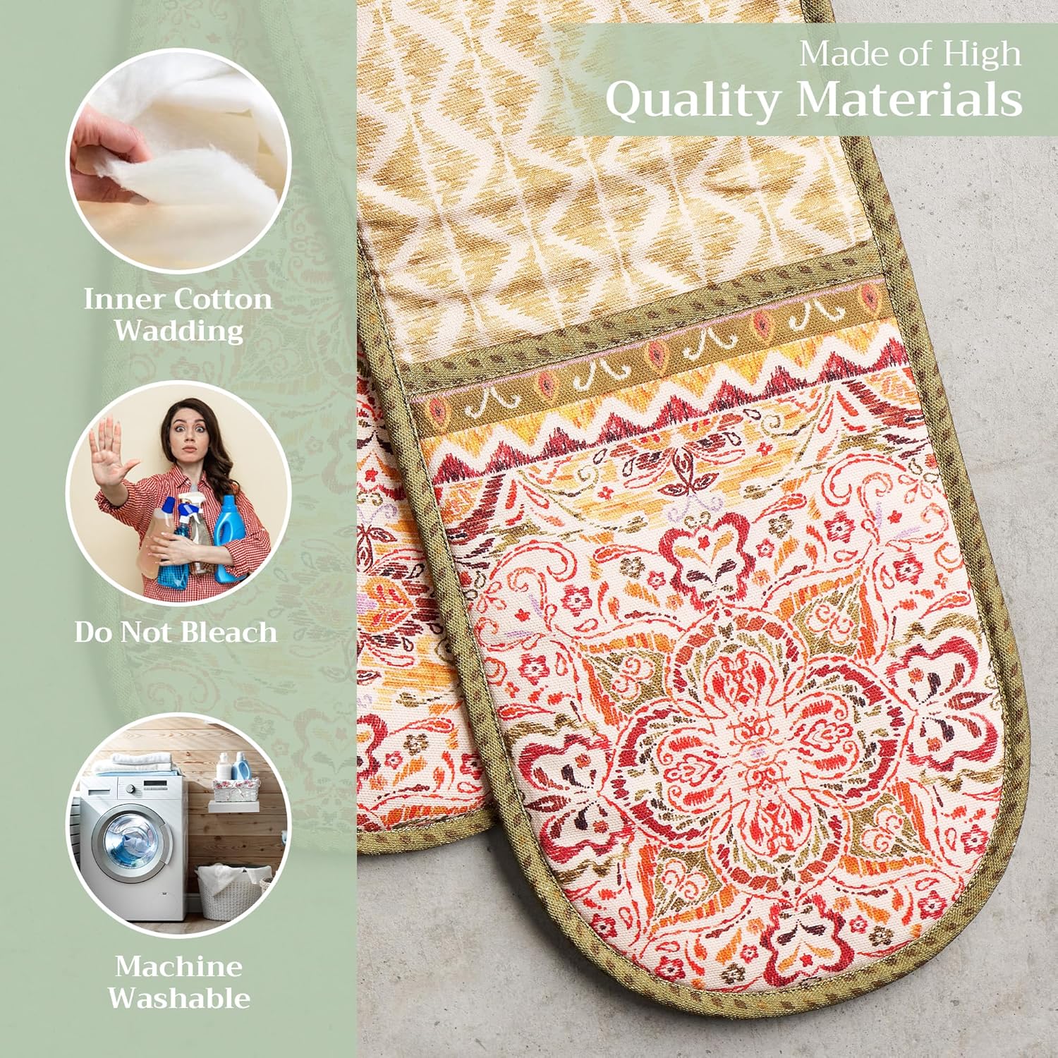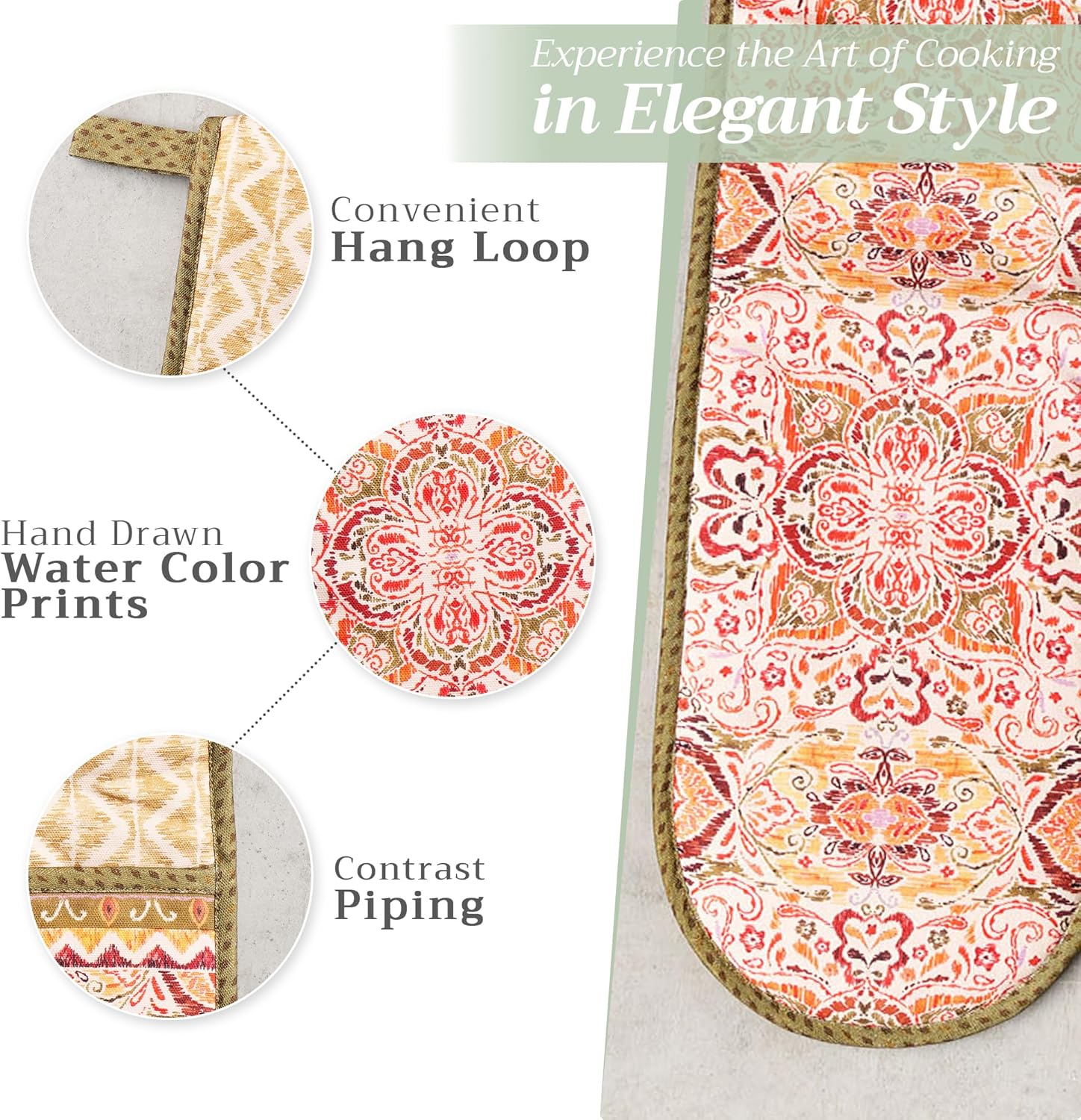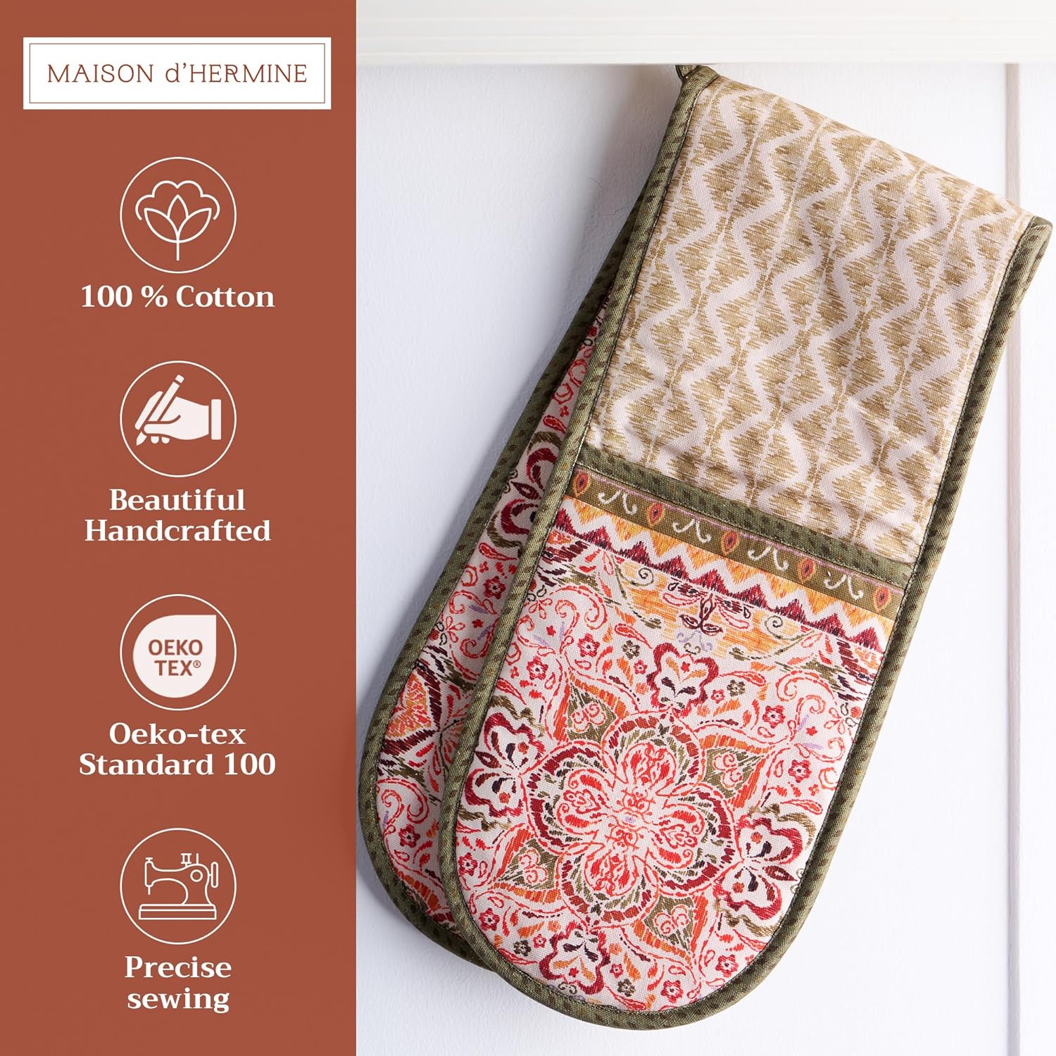 - Package includes: Includes 1 double oven mitt sized 7"x35". Perfect for handling hot cookware safely while adding a touch of European elegance to your kitchen. Designed in Europe and made in India with care