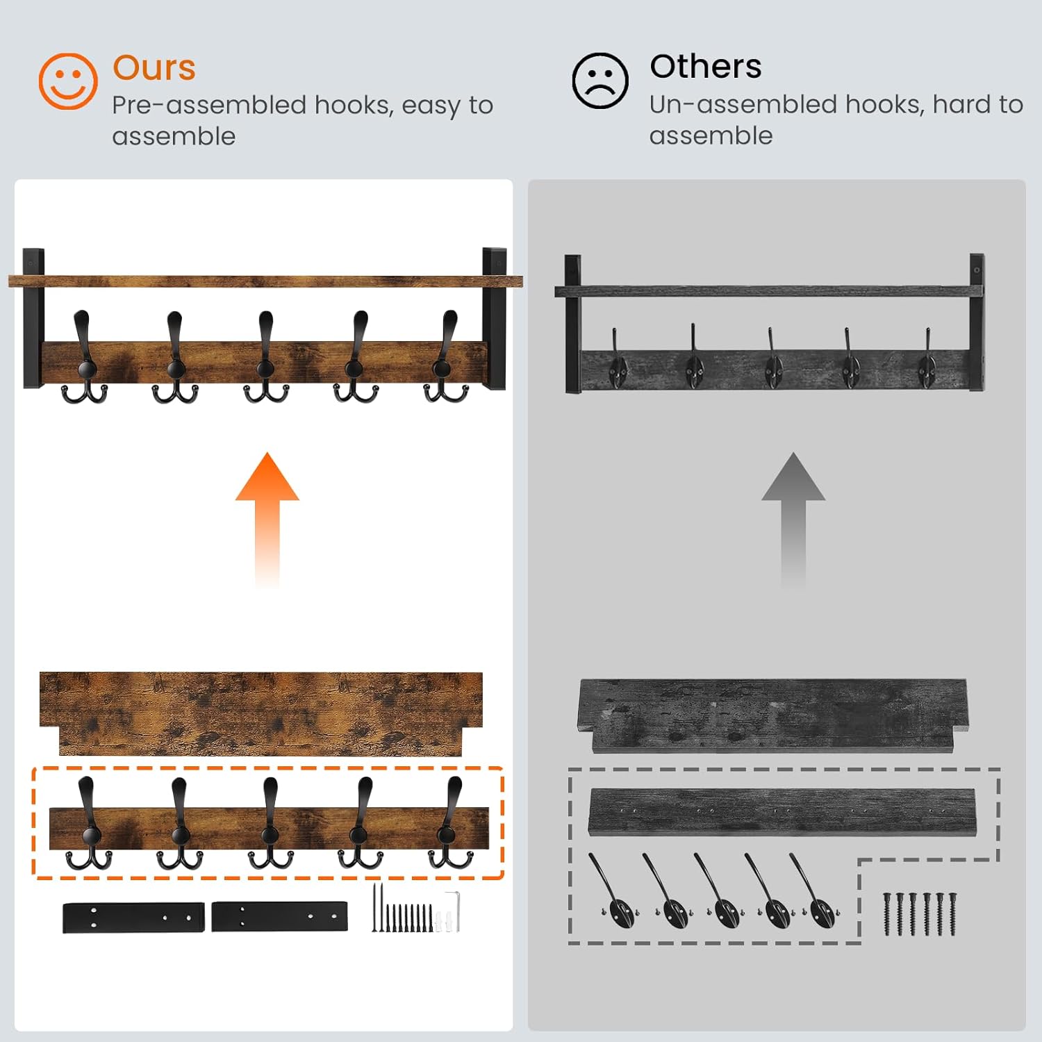 - QUICK AND EASY TO INSTALL: The coat rack comes with the hooks attached, no assembly required; Come with durable screws, anchors and easy-to-understand instruction, pre- drilled holes for mounting brackets, the coat hangers for wall can be easily assembled and firmly put in the wall
