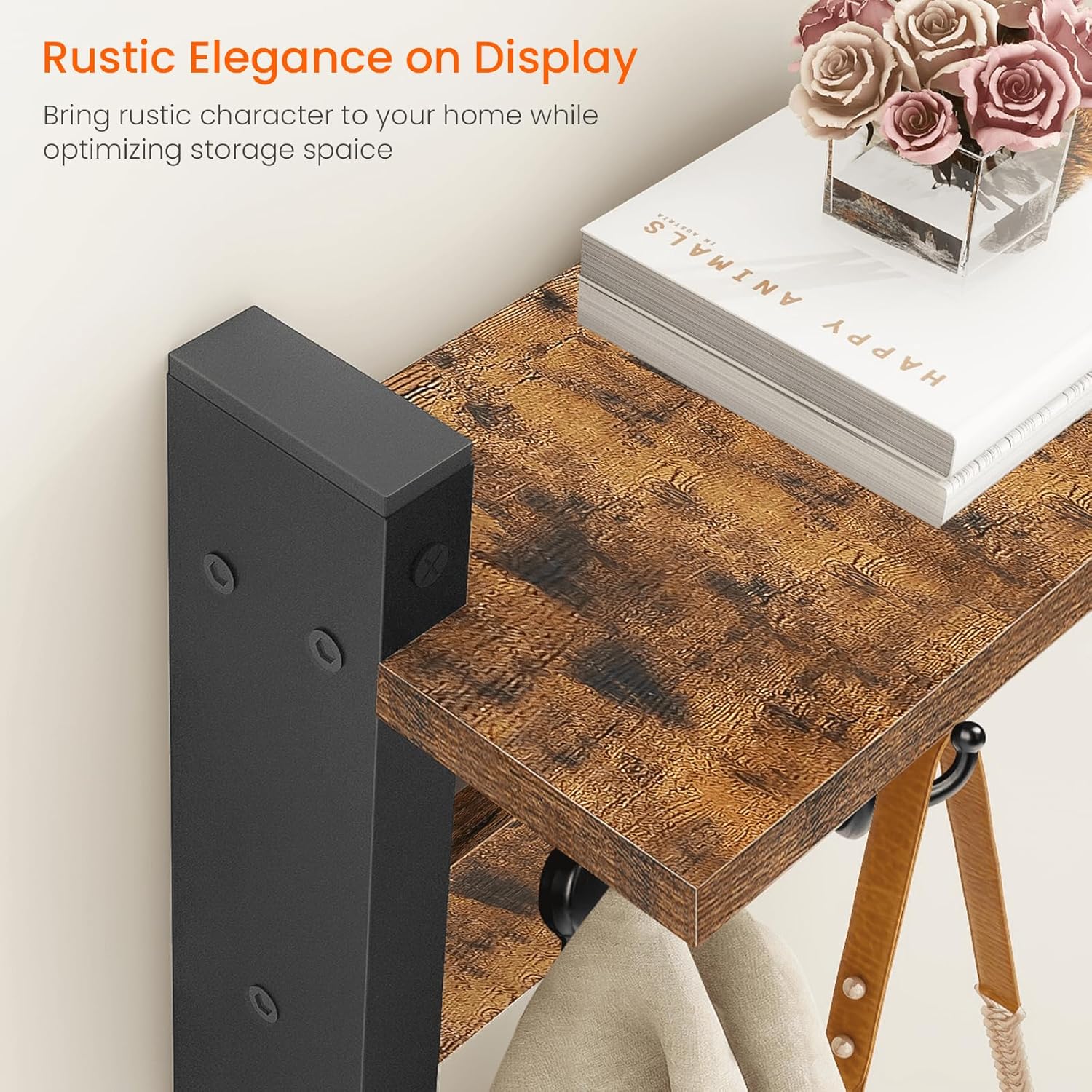 - MATCHE THE AESTHETIC: Rustic brown wood surface for an old-time classic look, rigid black iron for industrial chic style, they now come together on this shelf with hooks to bring a elegant style to your home and go along with your theme in entryway, hallway, bathroom or bedroom