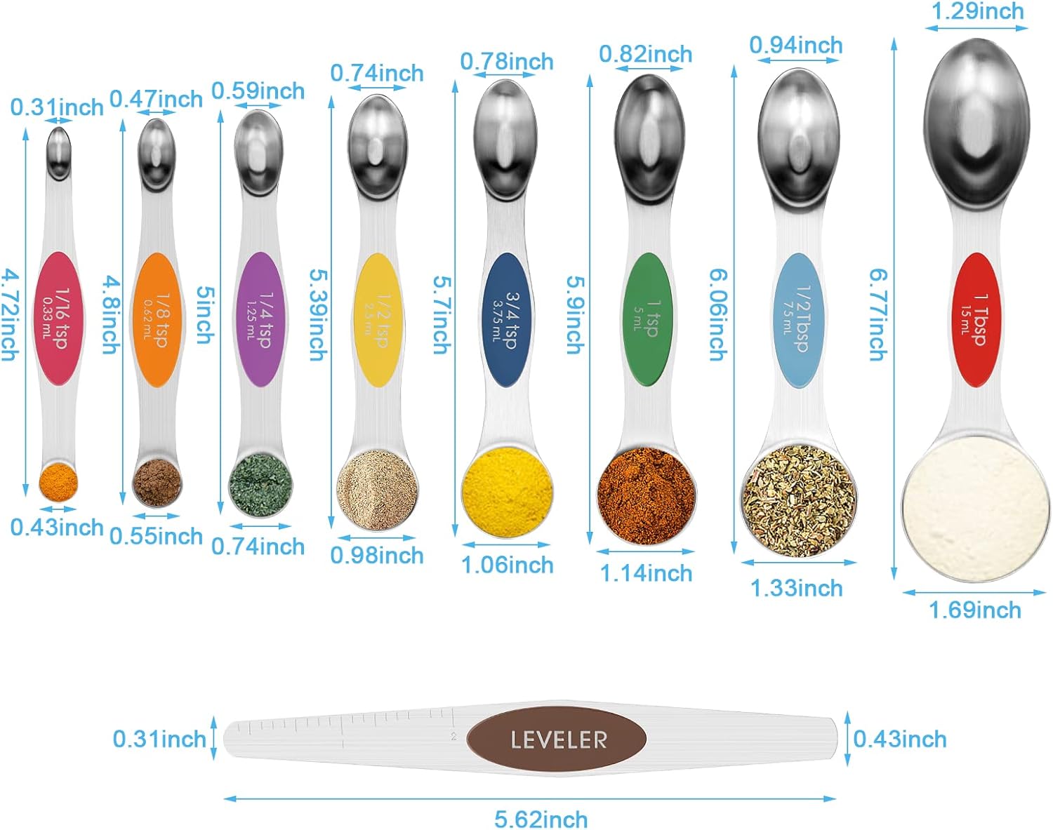 - 【Well-Designed 9-Piece Set】The Magnetic tablespoon set contains 8 metal measuring spoons: 1/16 tsp, 1/8 tsp, 1/4 tsp, 1/2 tsp, 3/4 tsp, 1 tsp, 1/ 2 tbsp, 1 tbsp, and 1 scraper. Dual sided: The oval end is narrow to fit into most spice jars. The round end is perfect for liquids. These stainless measuring spoons are great for measuring spice, sugar, salt, oil, coffee, wheat etc. Make your cooking and baking easier and more fun.