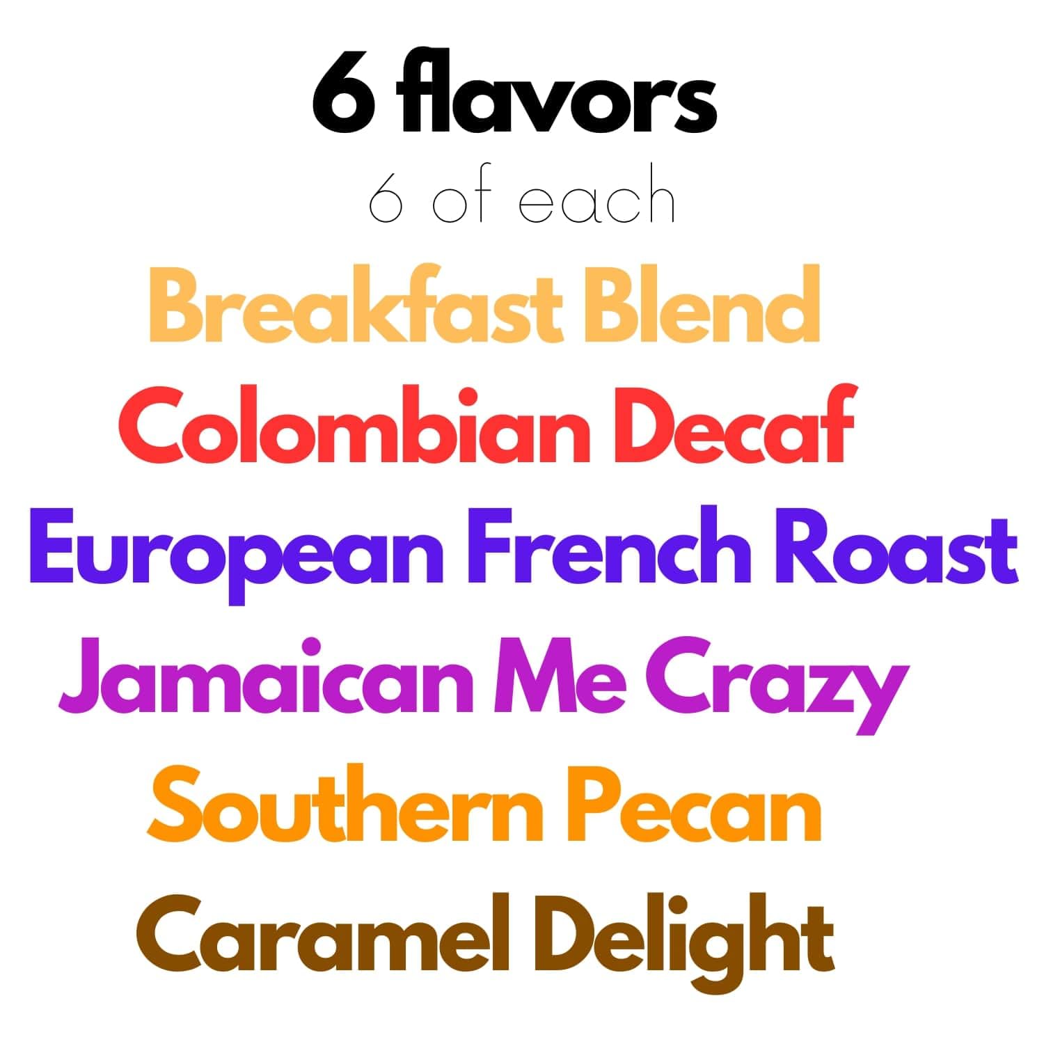 - GOURMET ORIGINAL VARIETY - Our Original Variety Assortment contains 6 Breakfast Blend, 6 European French Roast, 6 Decaf, 6 Jamaican Me Crazy, 6 Southern Pecan, & 6 Caramel Delight. Having many gourmet cafe coffee options is certain to impress everyone. You will be feeling on top of the morning at eight oclock!