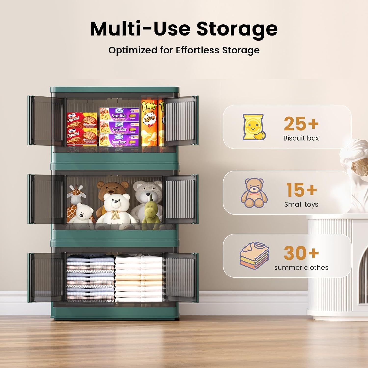 8.4Gal Collapsible Storage Bins with Lids & Wheels - 2 Pack Stackable with Doors, Heavy-Duty Plastic Containers for Home/Office, Green
