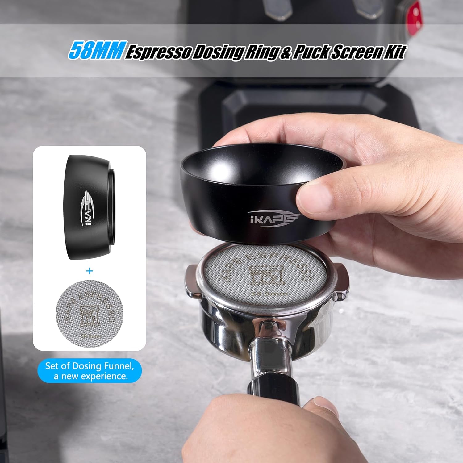 IKAPE Magnetic Dosing Funnel Set, 58MM Espresso Dosing Ring & Puck Screen Kit Compatible with 58MM Bottomless Portafilter - with 10 Small Magnet (Black)