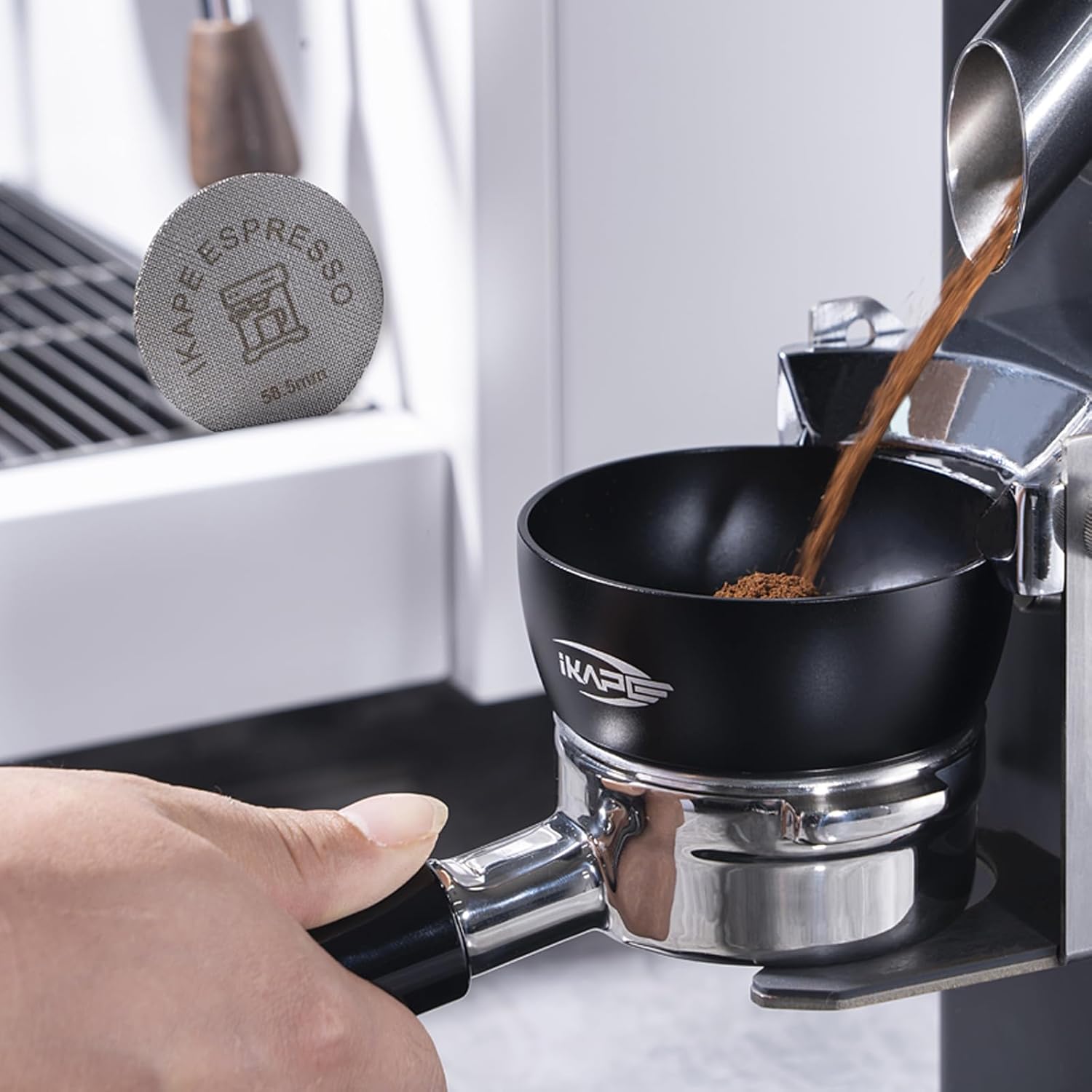 - Magnetic Dosing Funnel & Puck Screen Kit - Coming with a dosing funnel 58mm magnetic Dosing ring with ten evenly distributed magnets, with strong adsorption force, can steadily magnetic portafilter basket. In addition, it also comes with a 58.5mm espresso puck screen. Place them on the portafilter basket, and you can make delicious espresso