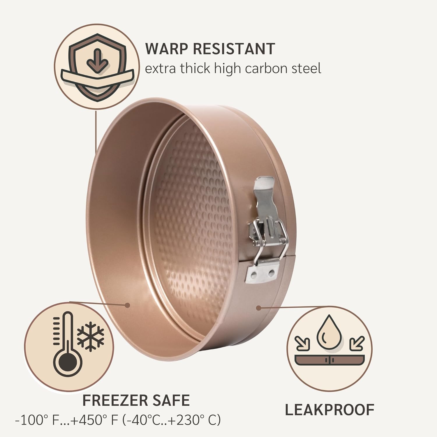 - 💯 Superior Heat Conduction – made from high quality carbon steel, this springform cake pan heats evenly and eliminates hot spots, avoiding burnt or undercooked cakes. Extra thick construction ensures uniform baking and long lasting durability.