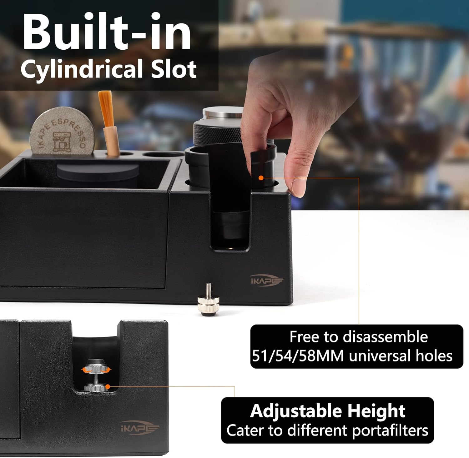 IKAPE Espresso Knock Box, Espresso Coffee Organizer Box Fit for Storage 51, 54, 58MM Espresso Tamper, Distributor, Portafilter & Puck Screen Accessories, Plastic Station Base(Black)