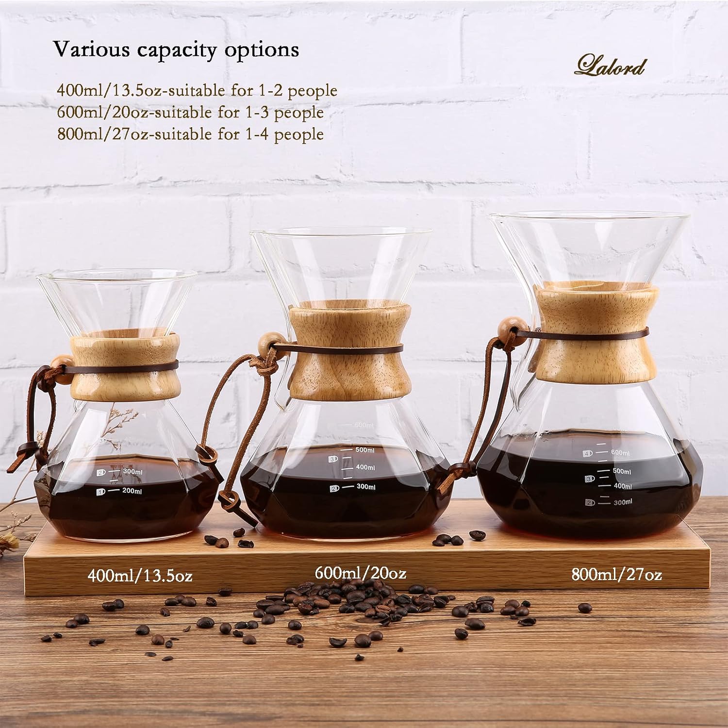 Pour Over Coffee Maker with Stainless Steel Filter, 20 oz Borosilicate Glass Coffee Carafe, Wooden Collar, Coffee Maker Carafe, Hold 3-4 Cups, 600 ml, Clear