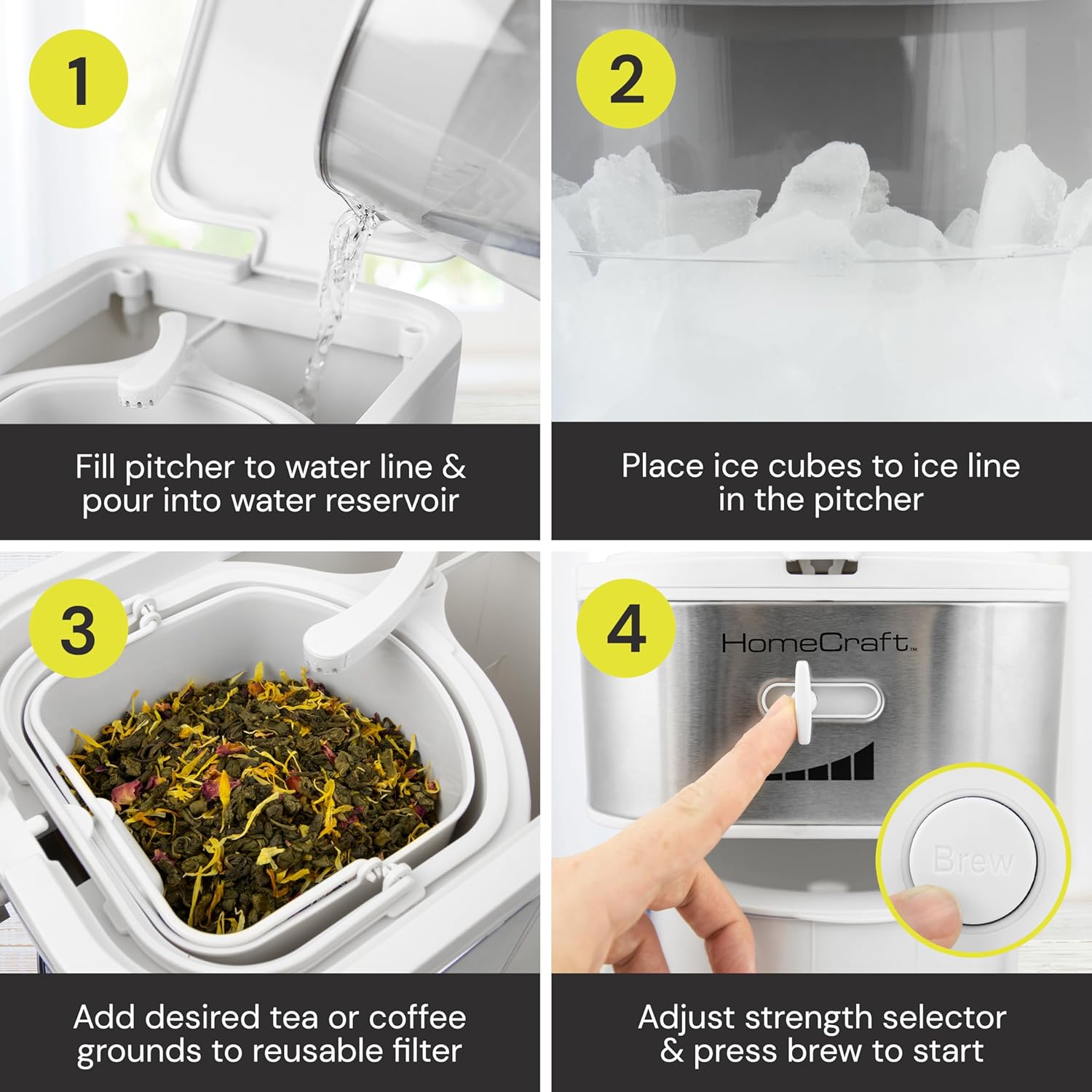 HomeCraft 3-Quart White Stainless Steel Café' Iced Tea And Iced Coffee Brewing System, 12 Cups, Strength Selector & Infuser Chamber, Perfect For Lattes, Lemonade, Flavored Water, Large Pitcher