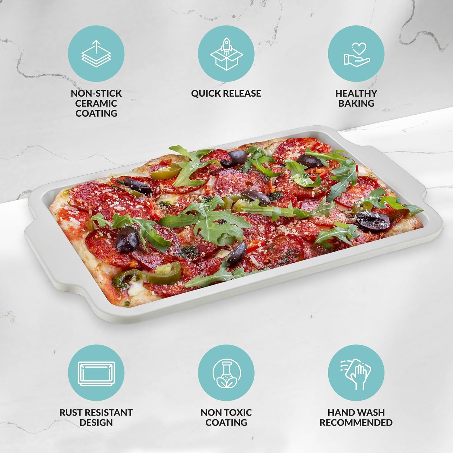 - DURABLE SHEET PAN: This baking sheet pan is made from premium carbon steel material with ceramic coating, guaranteeing long-lasting durability and heat resistance.The ideal nonstick oven pan for all your baking needs.