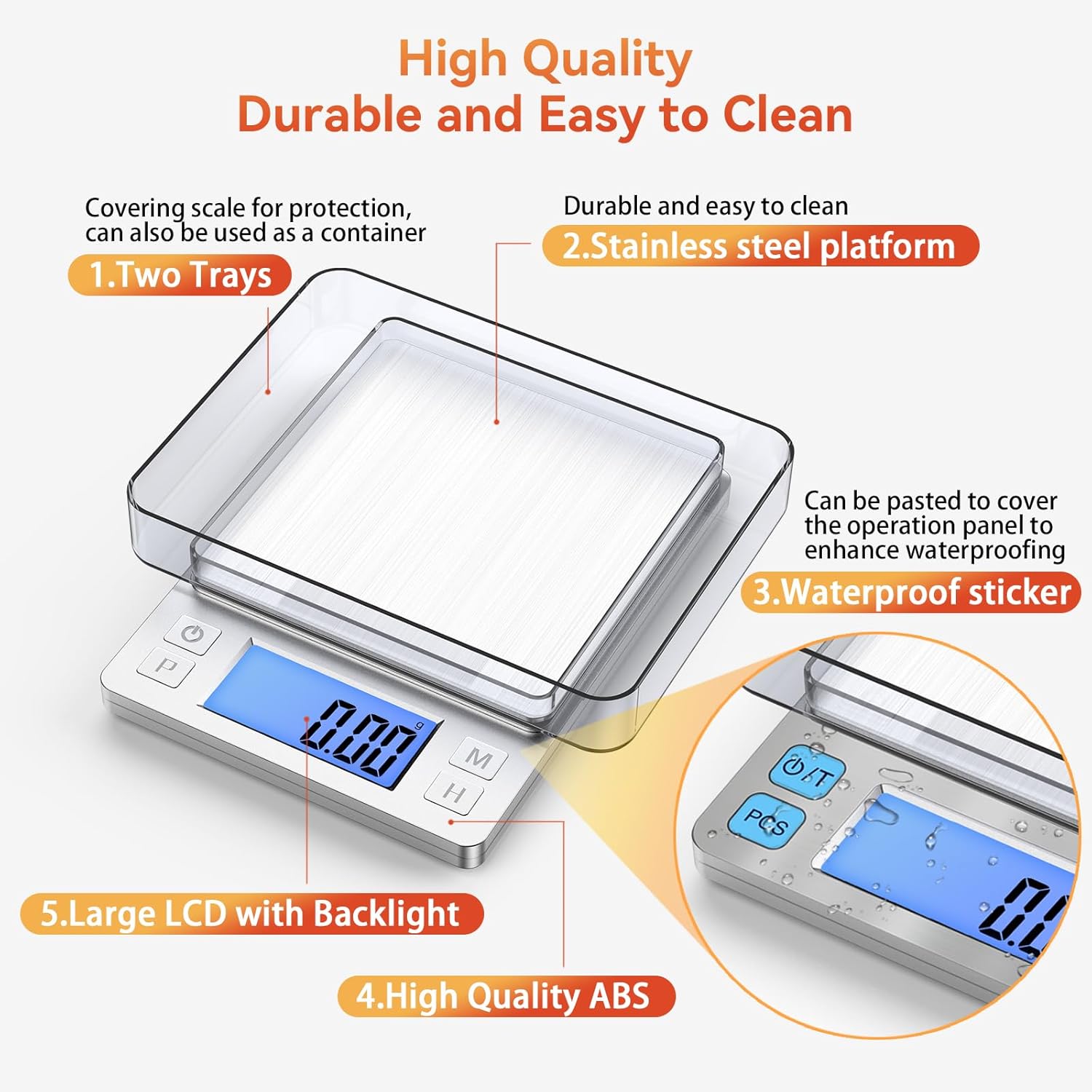 - [ Mini and Portable & High quality ] Size: 5.5 *4 *0.7 inches, taking up minimal kitchen space and conveniently portable. The scale platform made of stainless steel is durable and easy to clean. Come with two trays. Added waterproof stickers can enhance waterproof ability.