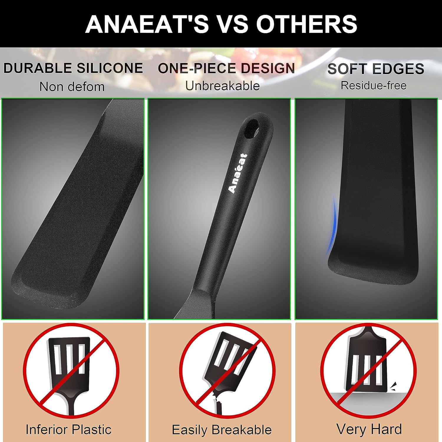 - BRAND QUALITY GUARANTEE - QUALITY CAN SPEAK ITSELF. Anaeat focuses on kitchenware research and development. We are so confident that we have the best silicone thin spatulas on the market. If you have any problems with Anaeat products, feel free to send us a message by Amazon and we resend to you right away for free, or full money back. We are very concerned about every order, and try our best to Provide our customers with HEALTHY & DURABLE kitchen accessories.