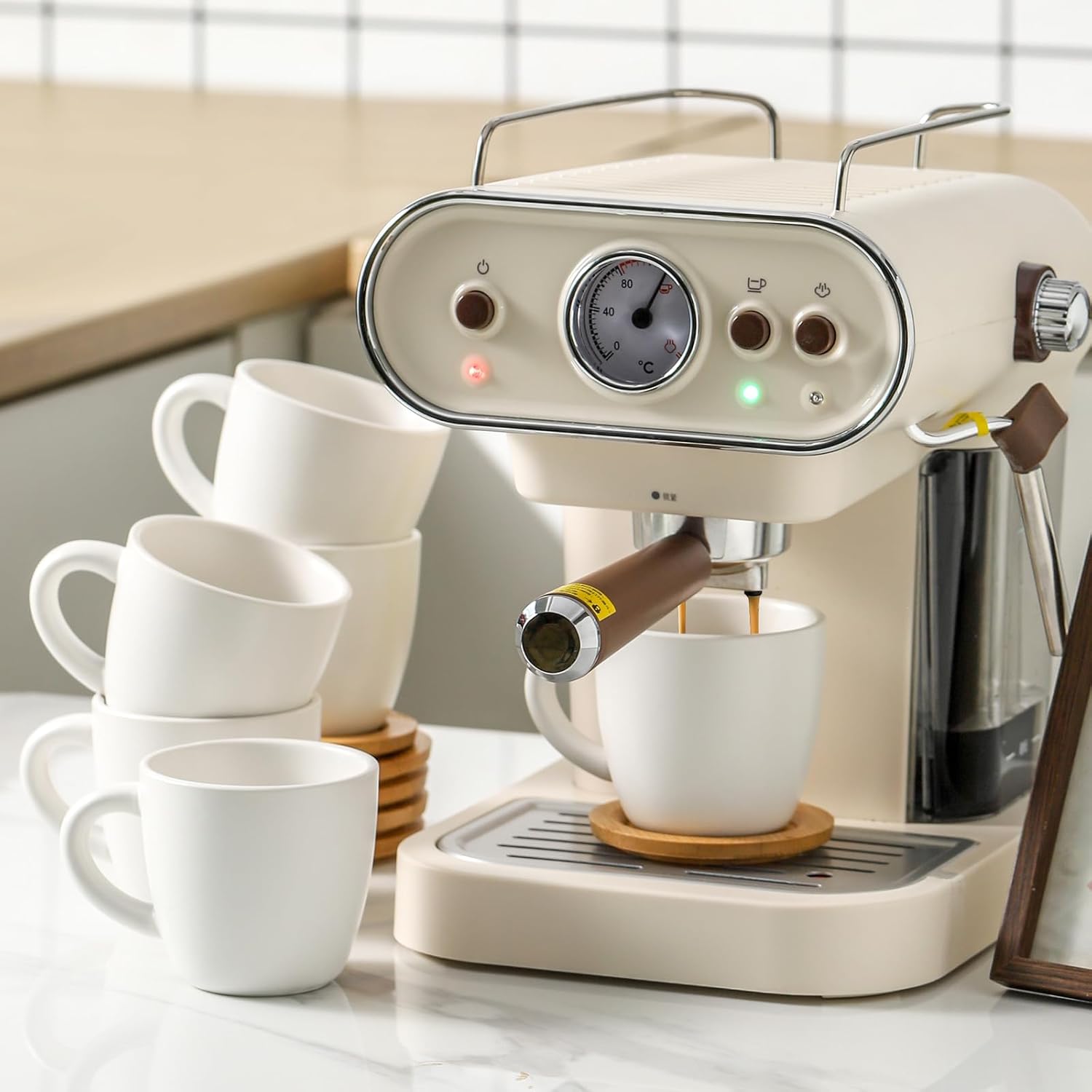 - NATURAL COLOR GLAZE: The cappuccino cups are designed with classic white color which can perfectly fit your espresso machine. The white coffee mugs with saucers have a cafe look that make you feel as if you are tasting your espresso at a coffee bar.
