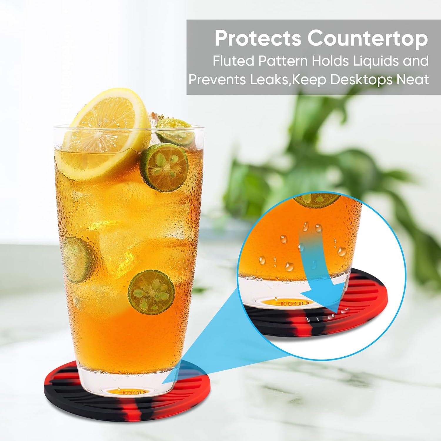 6 Pack Drink Coasters,Coasters for Drink with Holder,Non-Slip Silicone Cup Mat,Rubber Coaster Live for Hot or Cold Drink,Fits Any Size of Cups(Black Red)