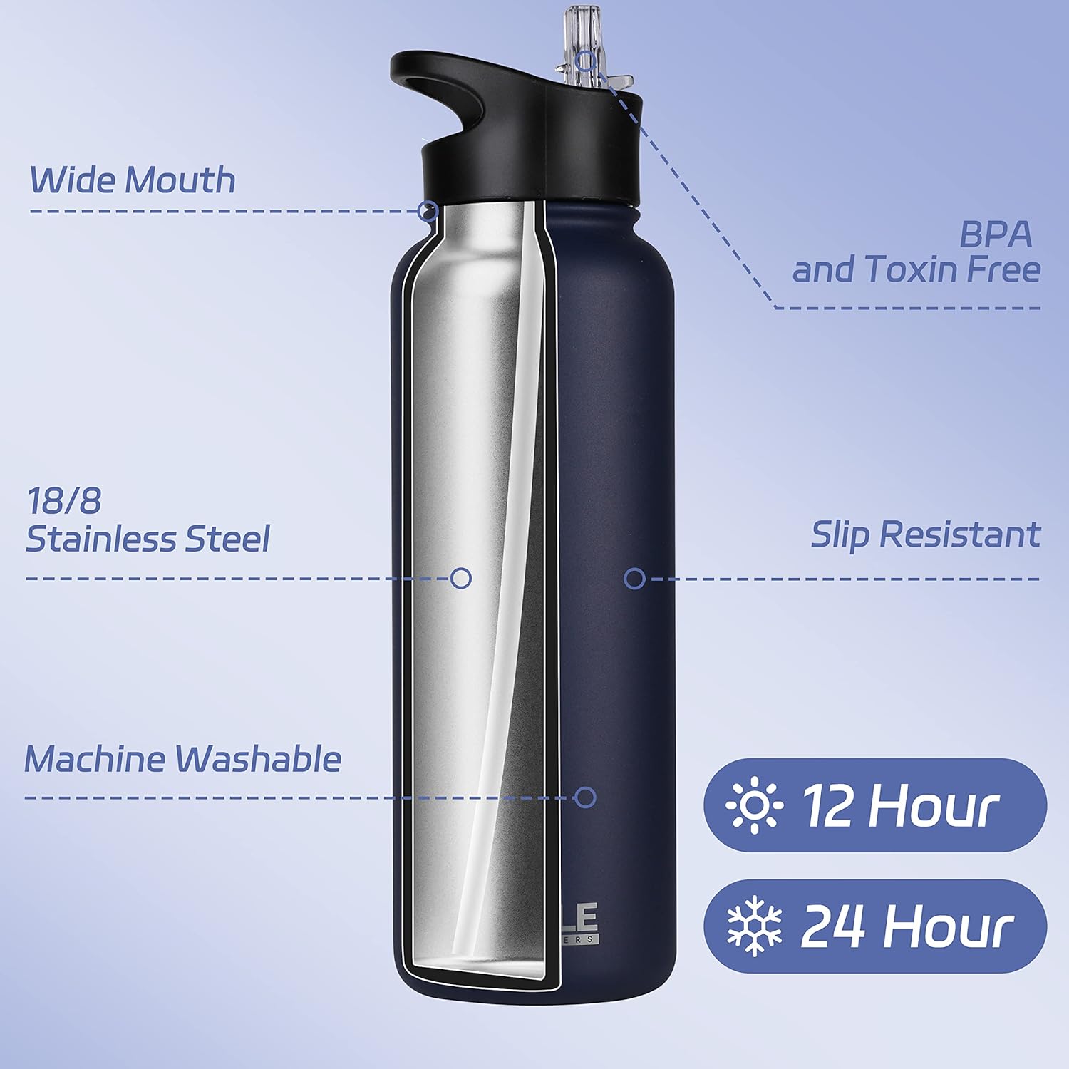 HASLE OUTFITTERS 40oz Stainless Steel Water Bottle, Vacuum Insulated Double Walled Leak Proof Sports Water Bottle with 2 Lids (Straw and Spout Lid) Thermo Mug Keep Cold and Hot(Navy,4)