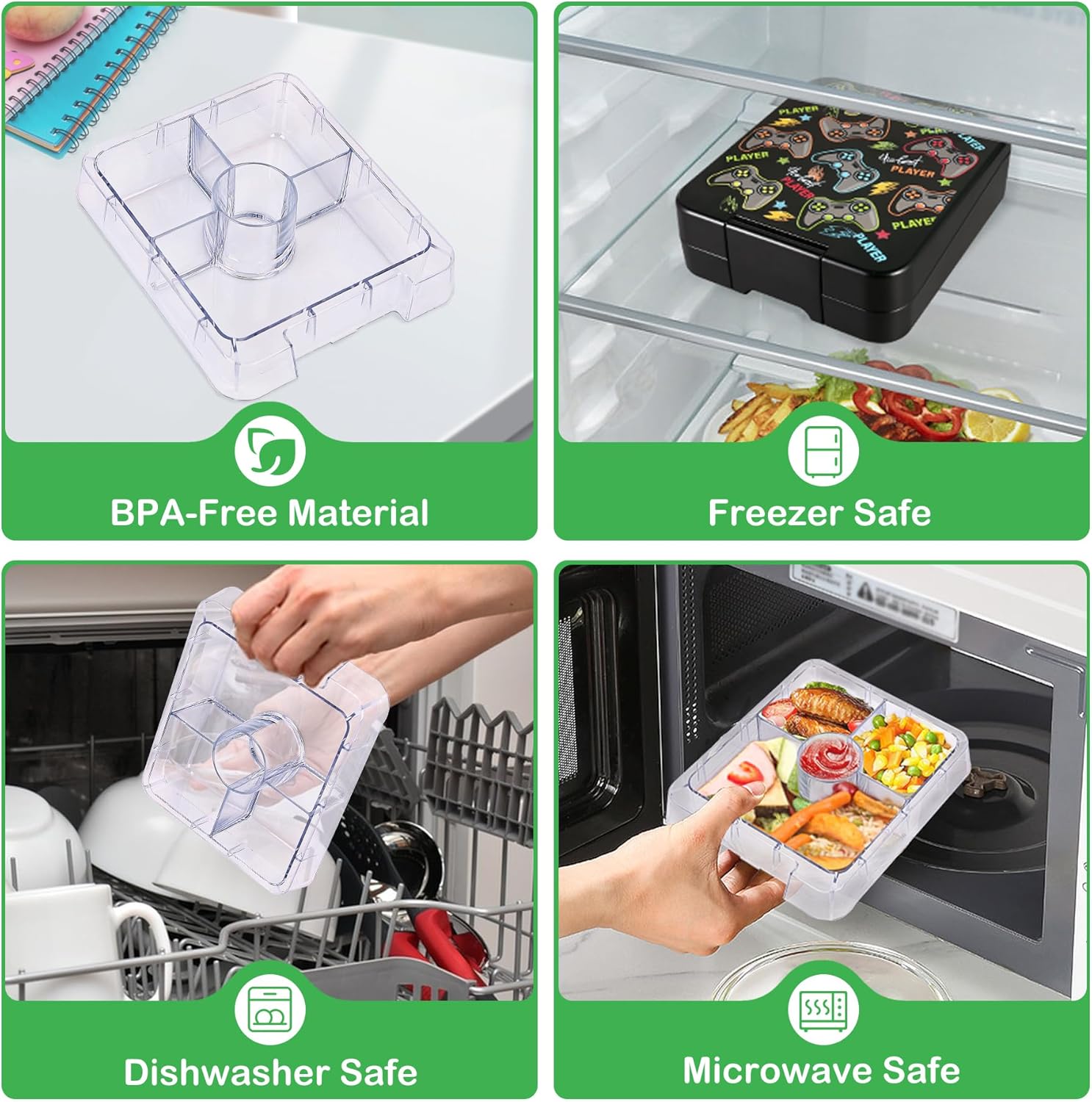 Bento Lunch Box Set With 10oz Soup Thermo, Leak-proof Lunch Containers with 4 Compartment, Kids Hot Thermo Food Jar/Insulation Lunch Bag, Food Containers for School (Black-Games)