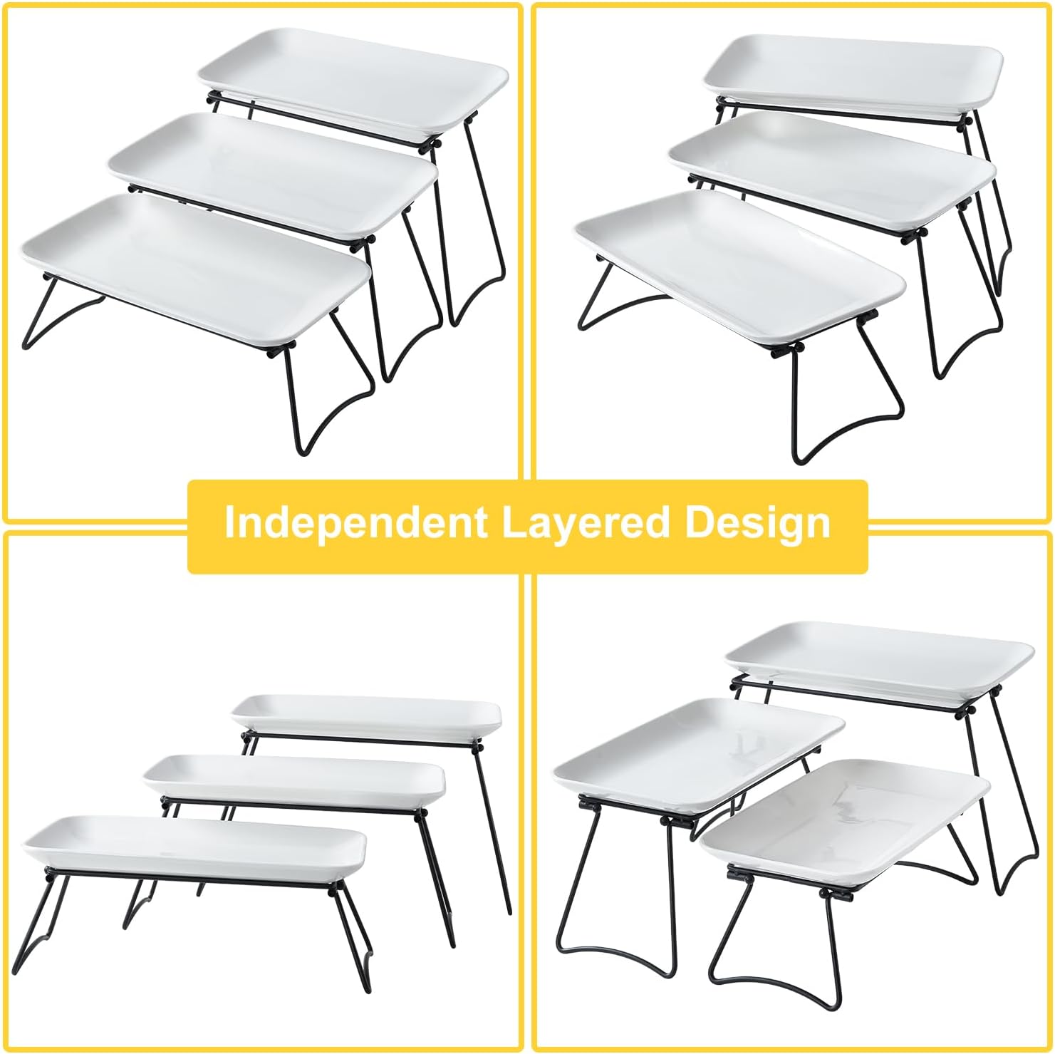 - Practical Tiered Tray Design - Our ingenious 3 tiered serving Trays use the new foldable stand. Then you can customize the placement you want to maximize your space.It brings a touch of elegance to your table, making serving a breeze and allowing guests to indulge in a feast of convenience.