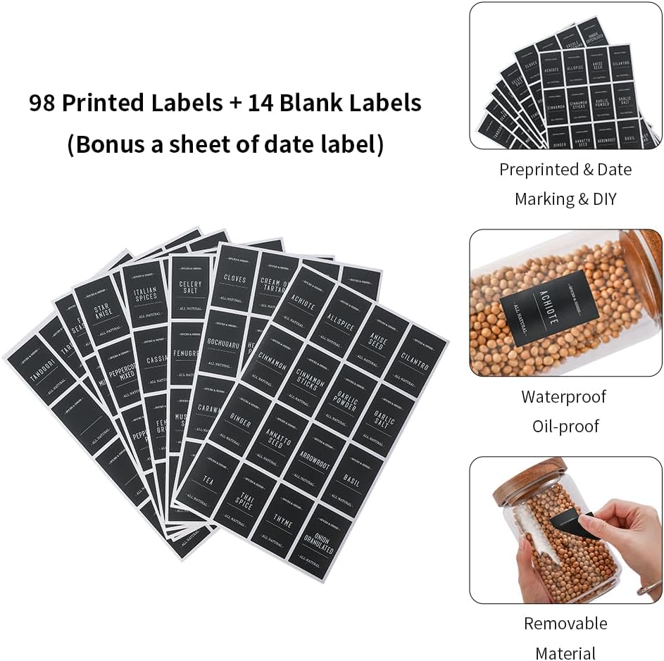 - What You Get - This set include 112 pcs labels (98 printed labels + 14 blank labels) and 6 jars