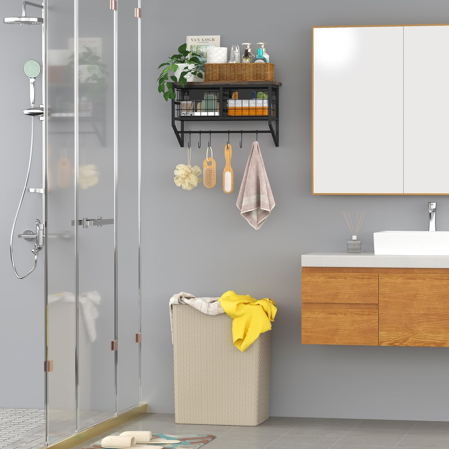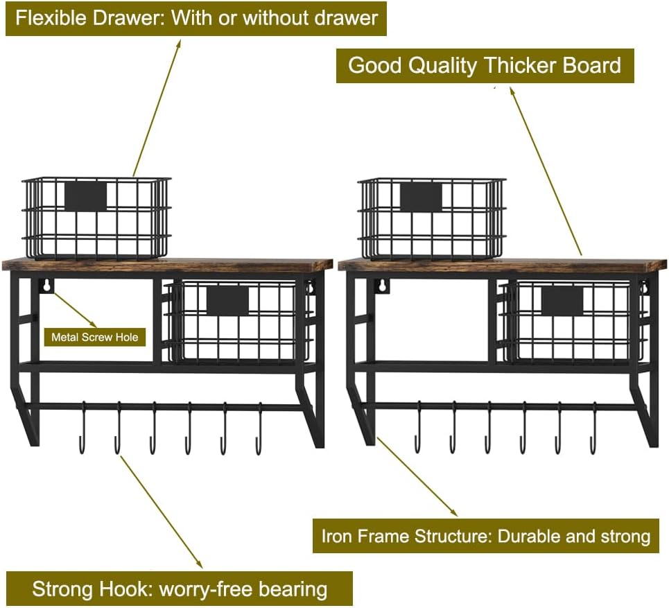 - 【Save Space】This 16in wood floating shelves with baskets is a charming decoration, will not occupy much place of the home. On the contrary, this wall storage organizer will create more storage space for you, can be combined with the fitment style of the home and placed in many venues like kitchens, bathroom, farmhouse and bars, garage, above toilet etc, any other where you want to install, Perfectly saves you space.