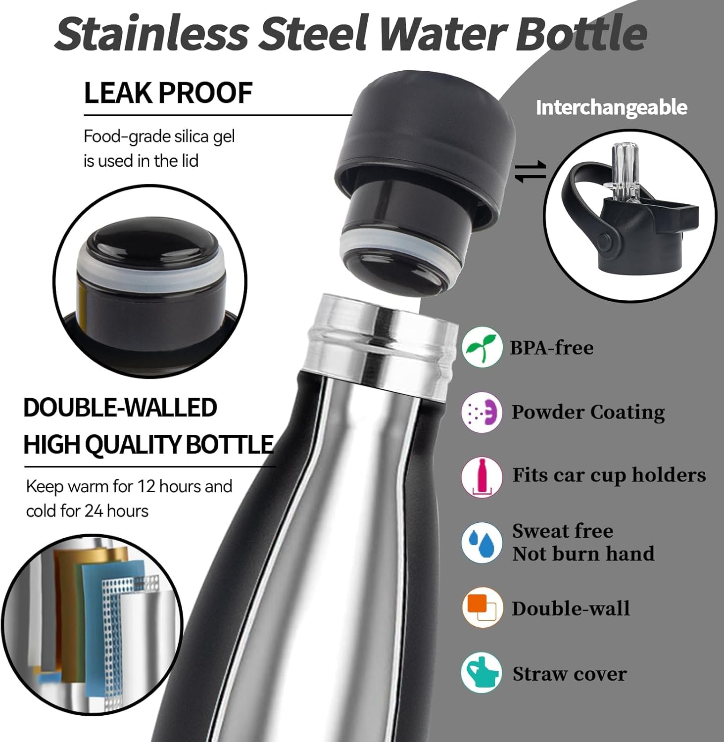 - COLORFUL & UNIQUE:Powder coating is the pinnacle of water bottle exteriors. Choose from a range of vibrant colors to match your personality and style. The Stainless Steel Metal water bottle is crafted with fashionable color powder coating, will not be scattered, discolored and difficult to scratch. Available in 9, 12,and 17-ounce sizes,making it easy to find the perfect size for your needs.