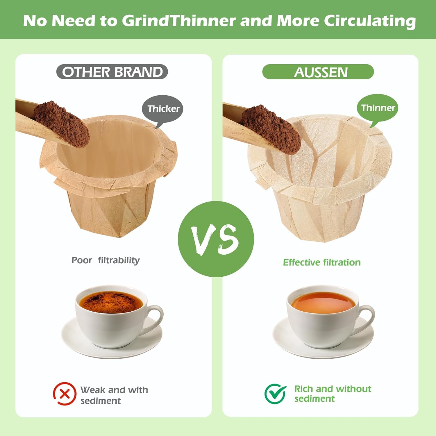- 【Nice Thickness】: The filter paper neither too thin to be split up or leak, nor too thick to make the coffee weak. Thinner but better flow through.Fits Into Most K-cups Paper Filters,Easily Flow Through With Good Test No Grounds: good quality disposable coffee filters help you to make a nice cup of coffee with good taste. Filter paper can filter most of coffee grounds and make the taste more silky and crema rich