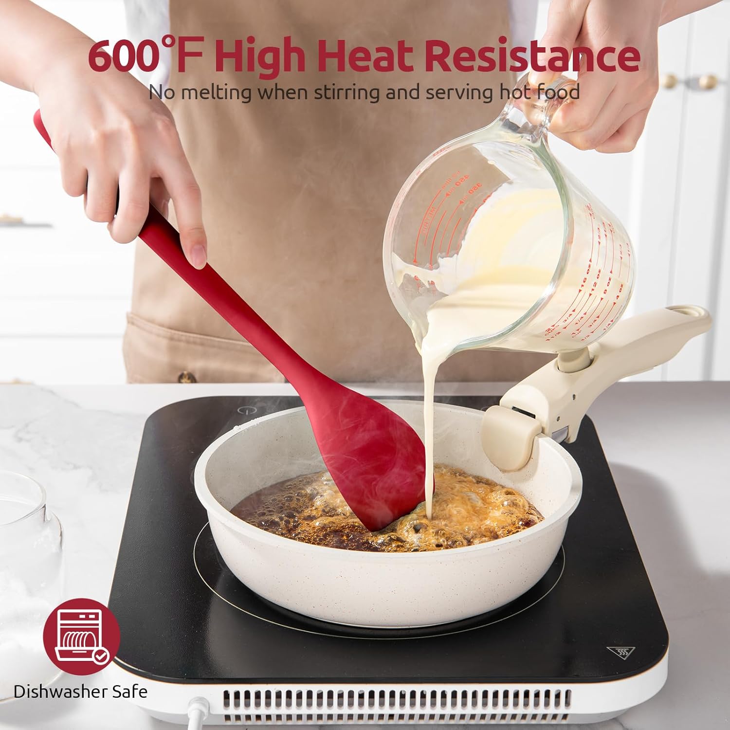 - [Scratchproof Silicone Tip Safe with Non-Stick Cookware] Using a kitchen silicon spoon is necessary so as to keep and not scratch the coating of non-stick pots and pans. These spoons come with a soft silicone tip. They are gentle on the stick-free surface to spare any damage to your fancy frypans or cookpots. If you are getting tired of the scratching sound by metal spoons, U-Taste mixing stirring kitchen spoon will be a great choice. The silicone handle provides a nice soft grip as well.